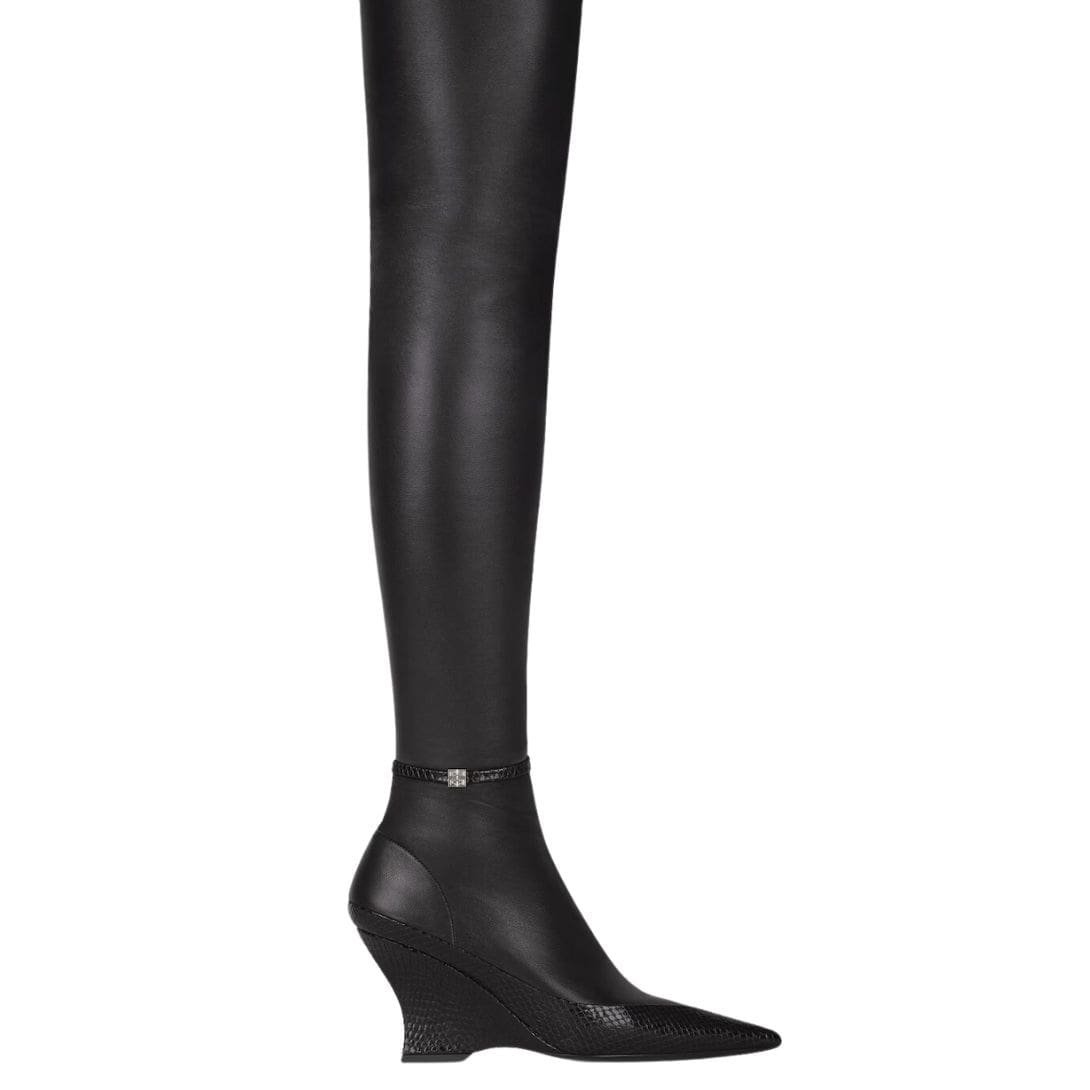 Complementing the leather is the exotic Ayers snakeskin detailing, which adds a unique texture and visual intrigue. The Ayers trim is strategically placed to accentuate the curves of the boots, creating a dynamic contrast between the smooth leather and the intricate pattern of the snakeskin. This combination of materials not only enhances the aesthetic appeal but also speaks to Givenchy’s commitment to using high-quality, luxurious elements in their designs. GIVENCHY RAVEN OVER THE KNEE BOOTS IN LEATHER AND AYERS