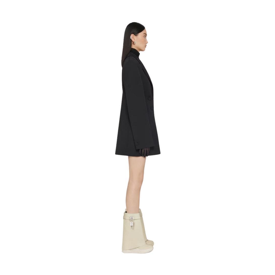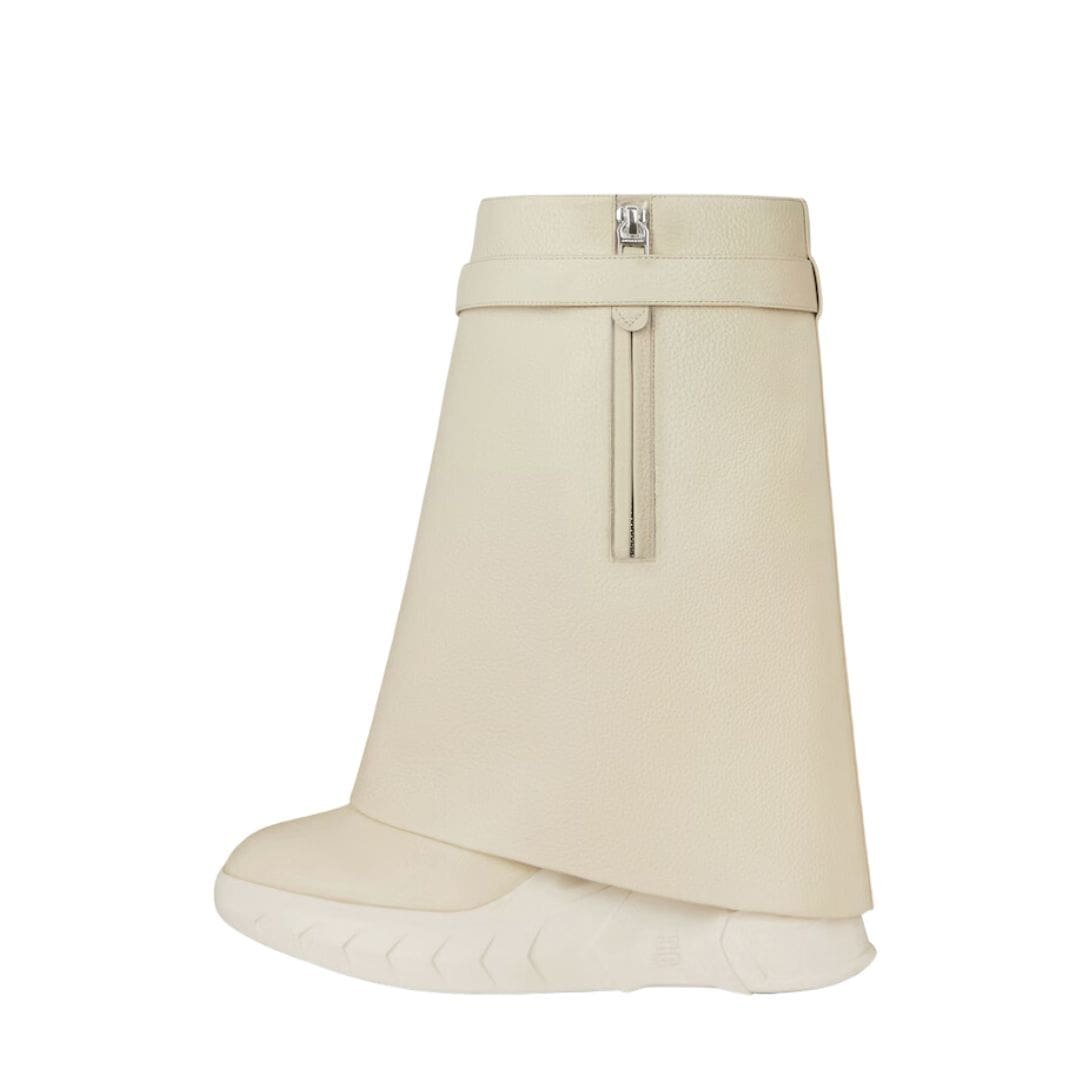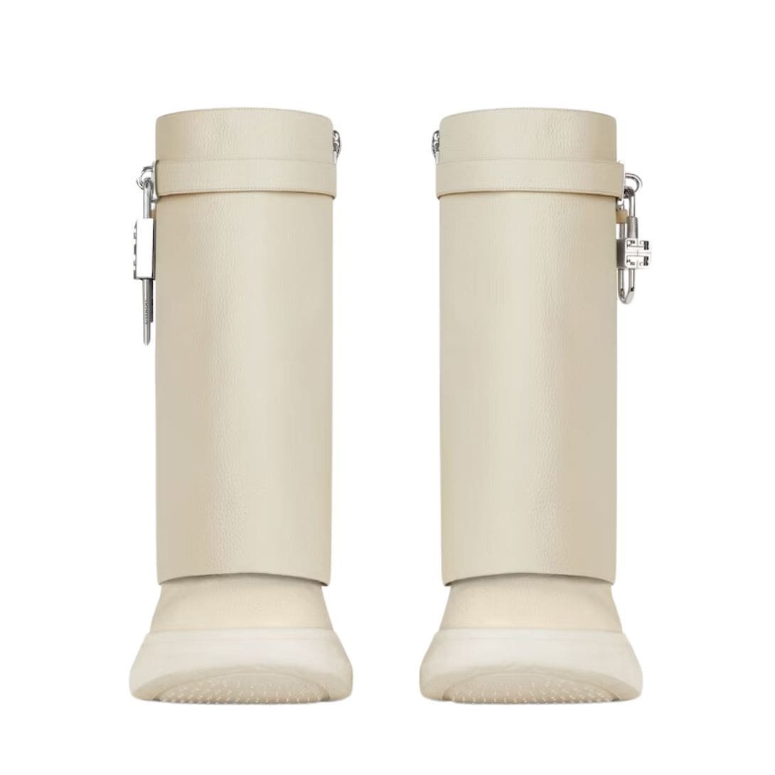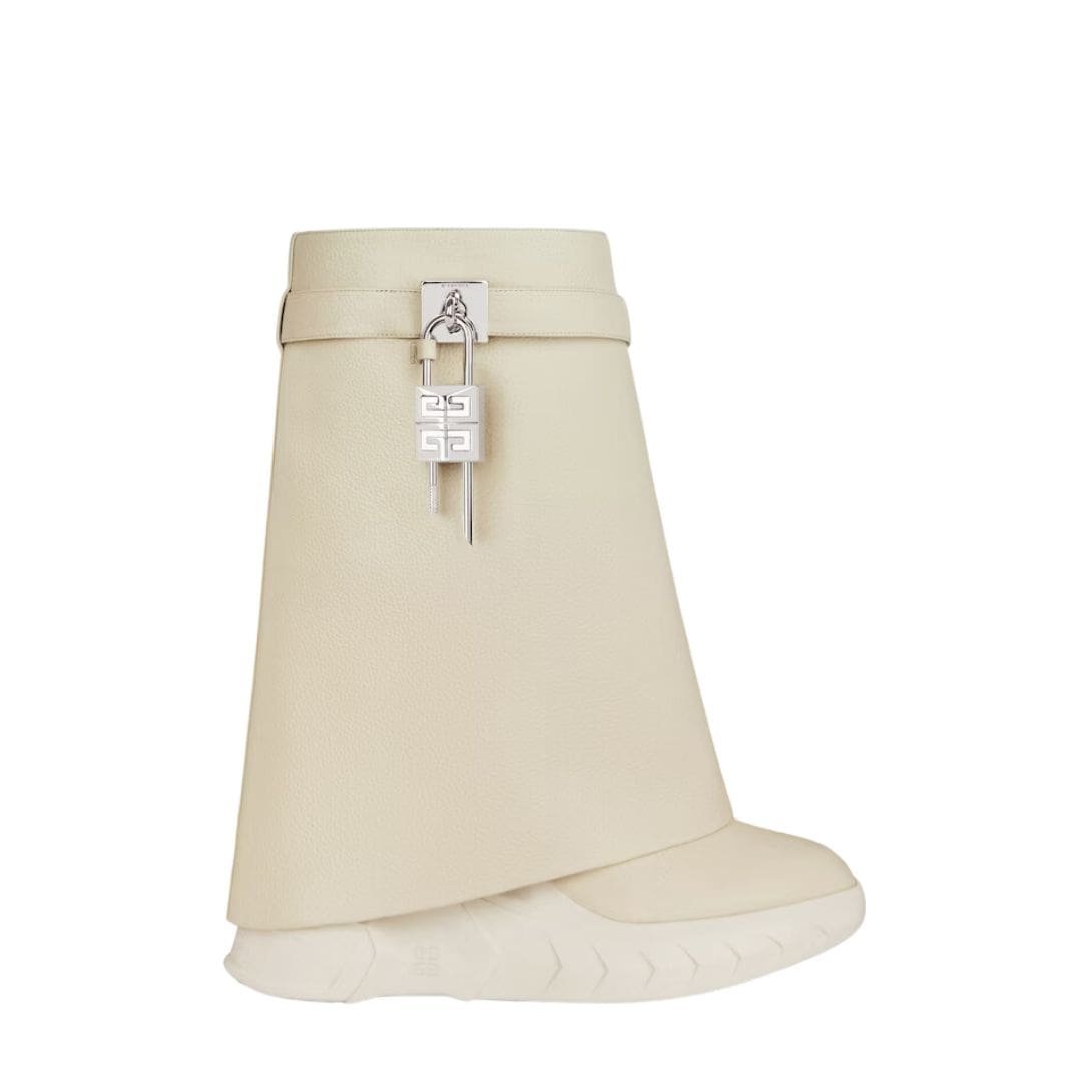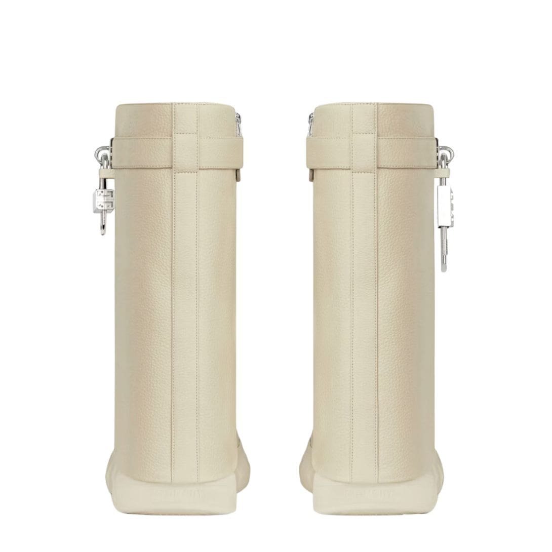 The design is characterized by its sleek, minimalist silhouette, which is accentuated by the bold shark lock closure. This distinctive feature, inspired by the raw, powerful aesthetics of marine life, is both functional and eye-catching. The lock itself is a signature Givenchy detail, featuring a polished metal finish that contrasts beautifully with the rich leather. This mechanism not only secures the boot but also adds an element of modernity to its classic shape.