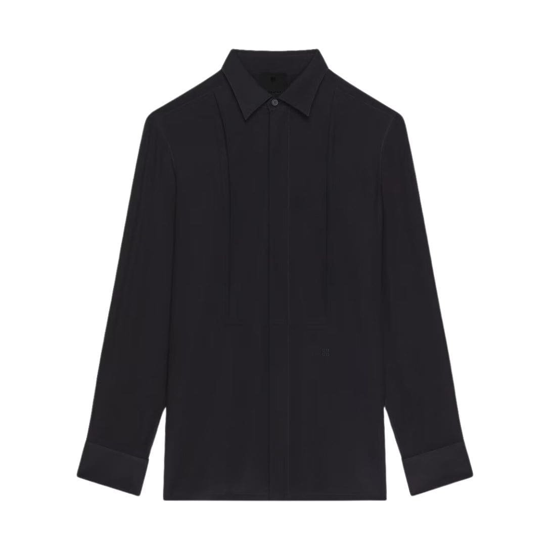 One of the standout features of this shirt is the plastron, a decorative panel that adds depth and visual interest to the design. The plastron is meticulously crafted, often featuring intricate pleating or embellishments, which showcase Givenchy’s attention to detail and expert tailoring. This element not only enhances the aesthetic appeal of the shirt but also adds a touch of classic sophistication, reminiscent of traditional formalwear with a modern twist.