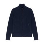 This cardigan features a sleek, contemporary design, characterized by its streamlined silhouette and clean lines. The front is adorned with a full-length zipper, adding a functional and stylish element to the piece. The zipper, finished in a subtle metallic tone, offers a sophisticated contrast to the rich texture of the wool and cashmere blend. It allows for versatile styling options, enabling you to wear the cardigan open for a relaxed look or zipped up for a more polished appearance.