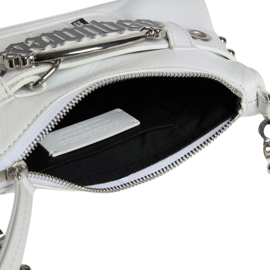 One of the most distinctive features of the Gothic Dsquared2 Belt Clutch is its incorporation of a detachable belt strap, which adds versatility to its wearability. This allows the clutch to be styled in multiple ways, whether carried as a handheld statement piece or worn across the body for a more casual yet chic look. The belt strap itself is adorned with intricate metalwork, echoing the ornate detailing found throughout the clutch.