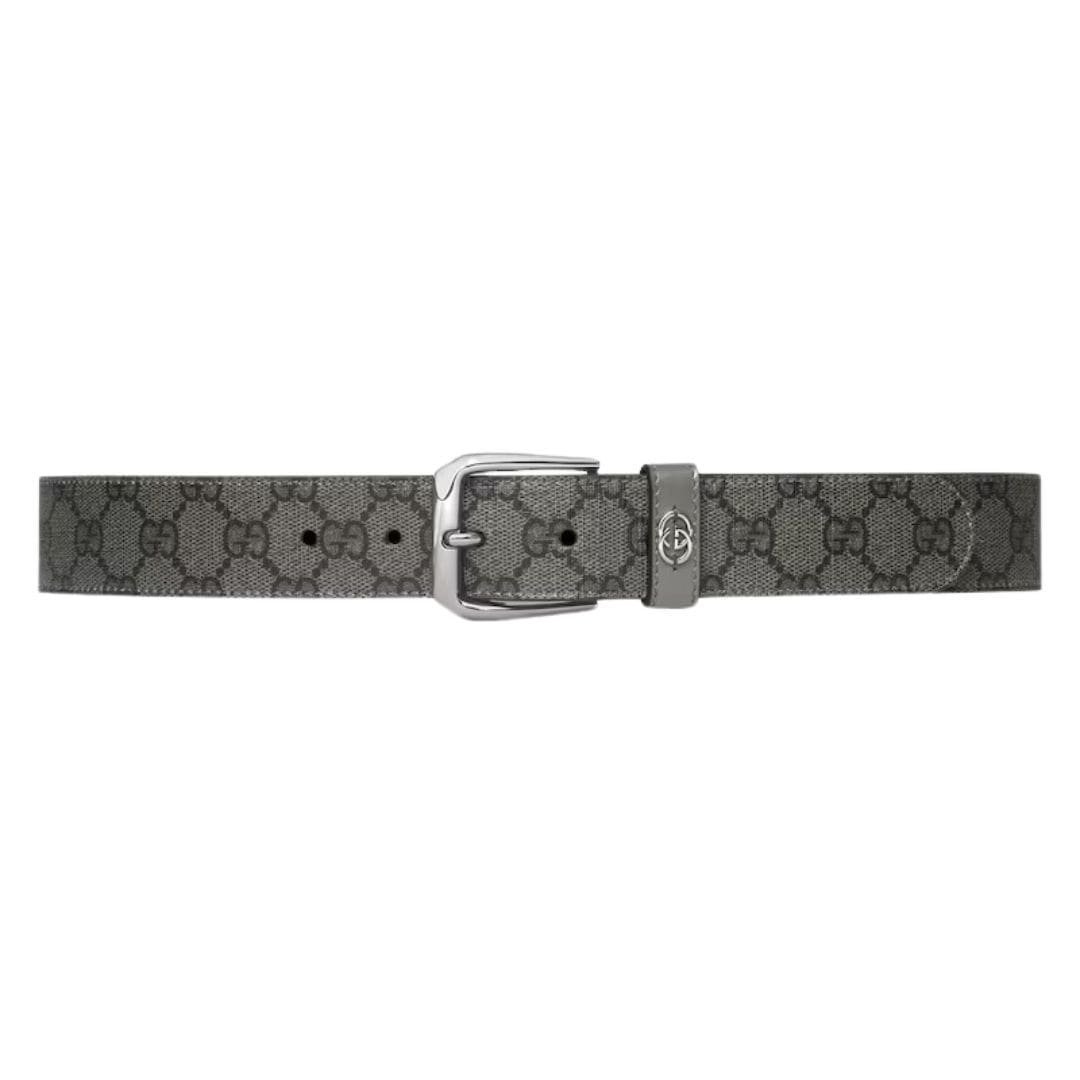 Gucci Belt With Interlocking G Detail In our ongoing commitment to innovation and timeless style, we present a classic reimagining of the GG Supreme. Each season, this emblematic material takes on new forms, embodying the essence of luxury and sophistication. Here, the GG monogram in dark shades defines a classic style tailored for men, complemented by a refined grey leather trim that adds a touch of understated elegance.