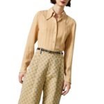 The focal point of the belt is the Gucci buckle, which features the iconic logo in shiny gold tone. This emblematic detail adds a touch of glamour and prestige to the accessory, showcasing the brand’s rich heritage and craftsmanship.