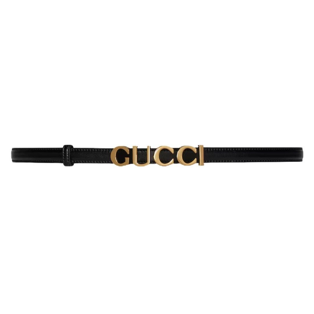 At Gucci, our dedication to reimagining classic designs, a timeless piece that embodies our commitment to luxury and innovation. Crafted from supple Gucci Buckle Thin Belt leather, this thin belt is adorned with the iconic Gucci logo hardware in a shiny gold tone, adding a touch of sophistication to any ensemble.