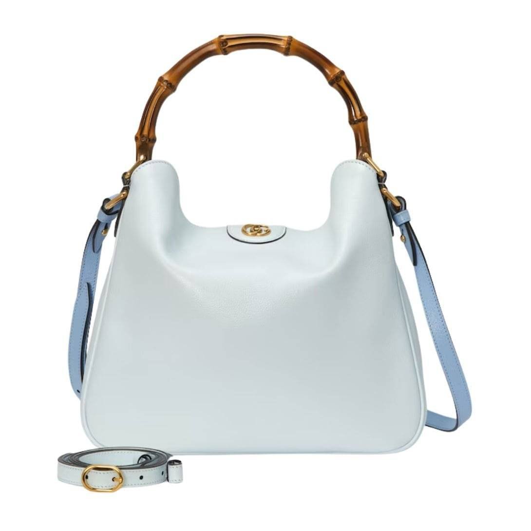 The Diana bag is rendered in rich, supple leather, available in a variety of classic hues and contemporary shades, each meticulously selected to complement its design. The bag’s structure is defined by its clean lines and gently rounded edges, which lend it a refined, understated charm. A standout feature is its iconic bamboo handle, a nod to Gucci’s heritage, which adds a touch of vintage allure and artisanal craftsmanship. GUCCI DIANA MEDIUM SHOULDER BAG
