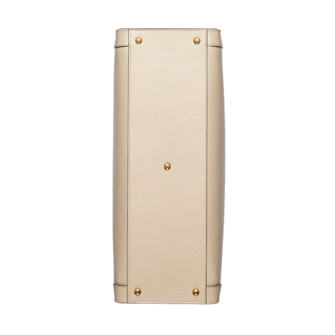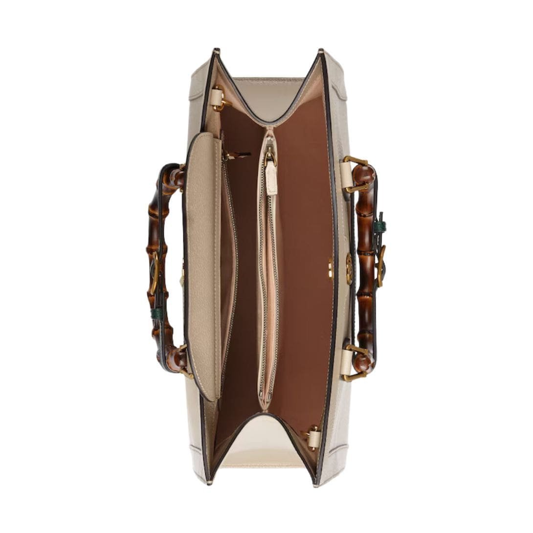 interior of the Gucci Diana Medium Tote Bag is thoughtfully designed with practicality in mind. It features multiple compartments, including a zip pocket and open pockets, providing ample space for essentials like a wallet, phone, and cosmetics. The interior is lined with soft, high-quality materials, ensuring that your belongings are protected and easy to access.