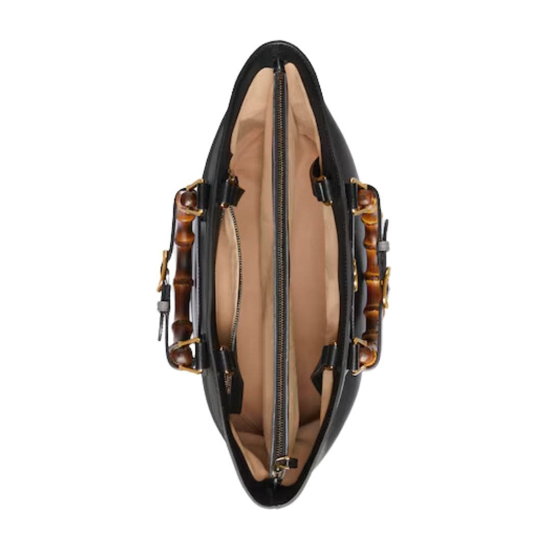 The tote’s design pays homage to Gucci’s heritage, featuring the iconic bamboo handles that have become a signature of the brand. These handles, meticulously crafted from sustainable bamboo, are not only visually striking but also durable and ergonomically designed for comfortable carrying. The bamboo adds a touch of natural charm, seamlessly integrating with the leather body for a harmonious blend of materials.