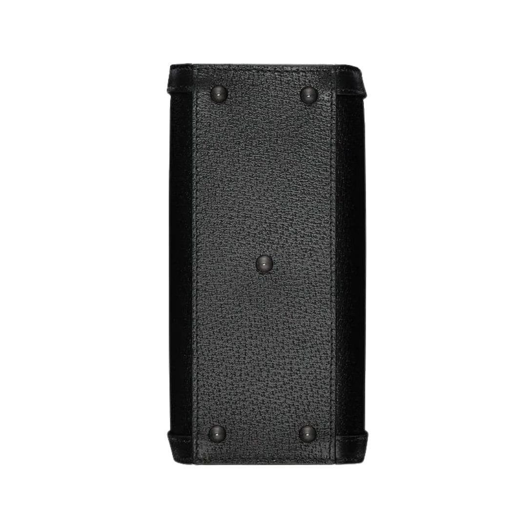 The bag’s design is further enhanced by its gold-toned hardware, which includes the signature double G logo prominently displayed on the front. This logo serves as a testament to Gucci’s rich heritage and commitment to quality. The interior of the bag is thoughtfully designed to maximize space despite its mini size. It features a single compartment lined with soft microfiber fabric, complete with a zip pocket and open pockets to keep essentials organized and easily accessible.