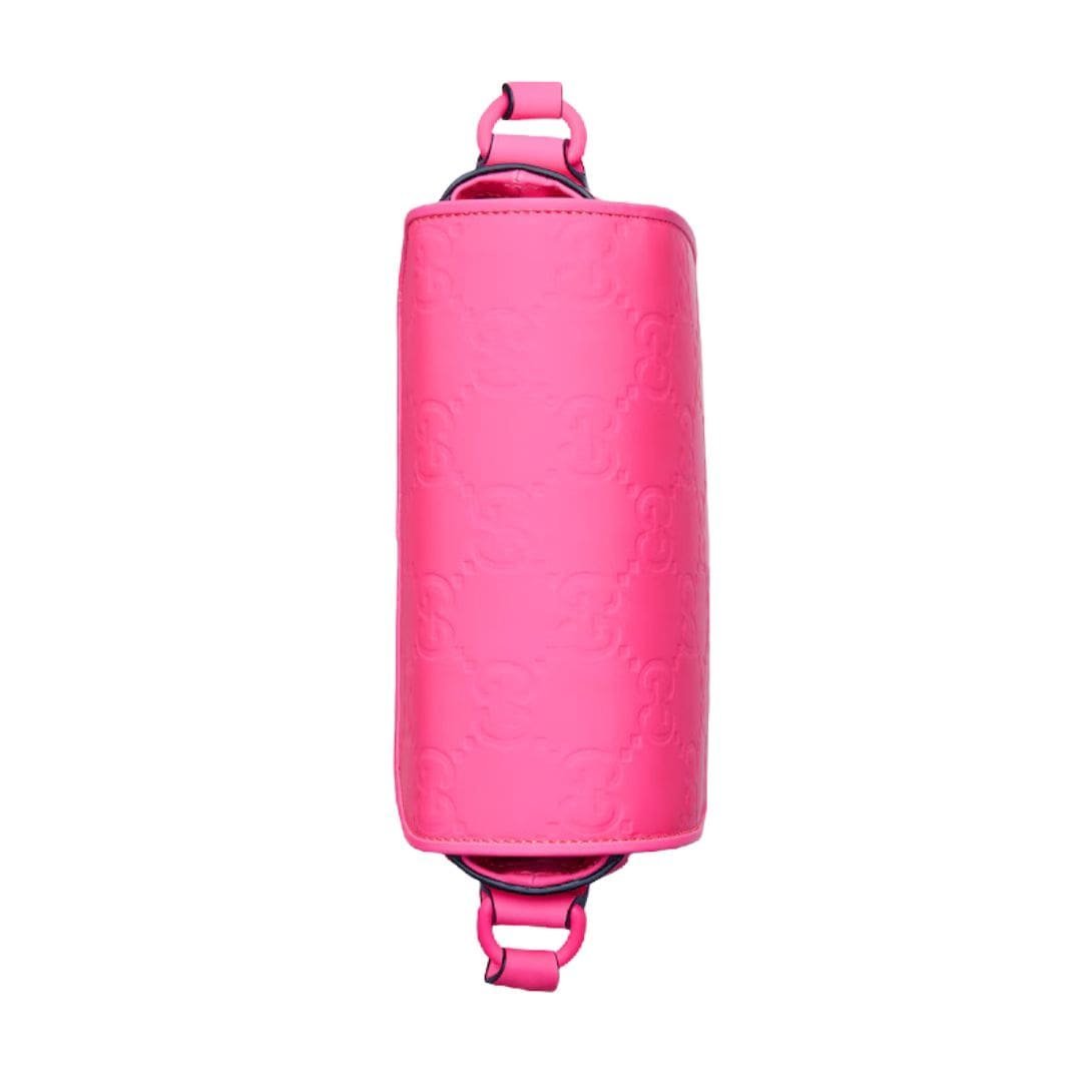 The bag is adorned with Gucci’s iconic GG logo, embossed prominently on the front. This subtle yet sophisticated branding element reinforces the bag’s prestigious heritage while blending seamlessly with its modern aesthetic. The GG logo is rendered in a complementary color that enhances the overall design without overwhelming it. GUCCI GG RUBBER EFFECT SUPER MINI BAG