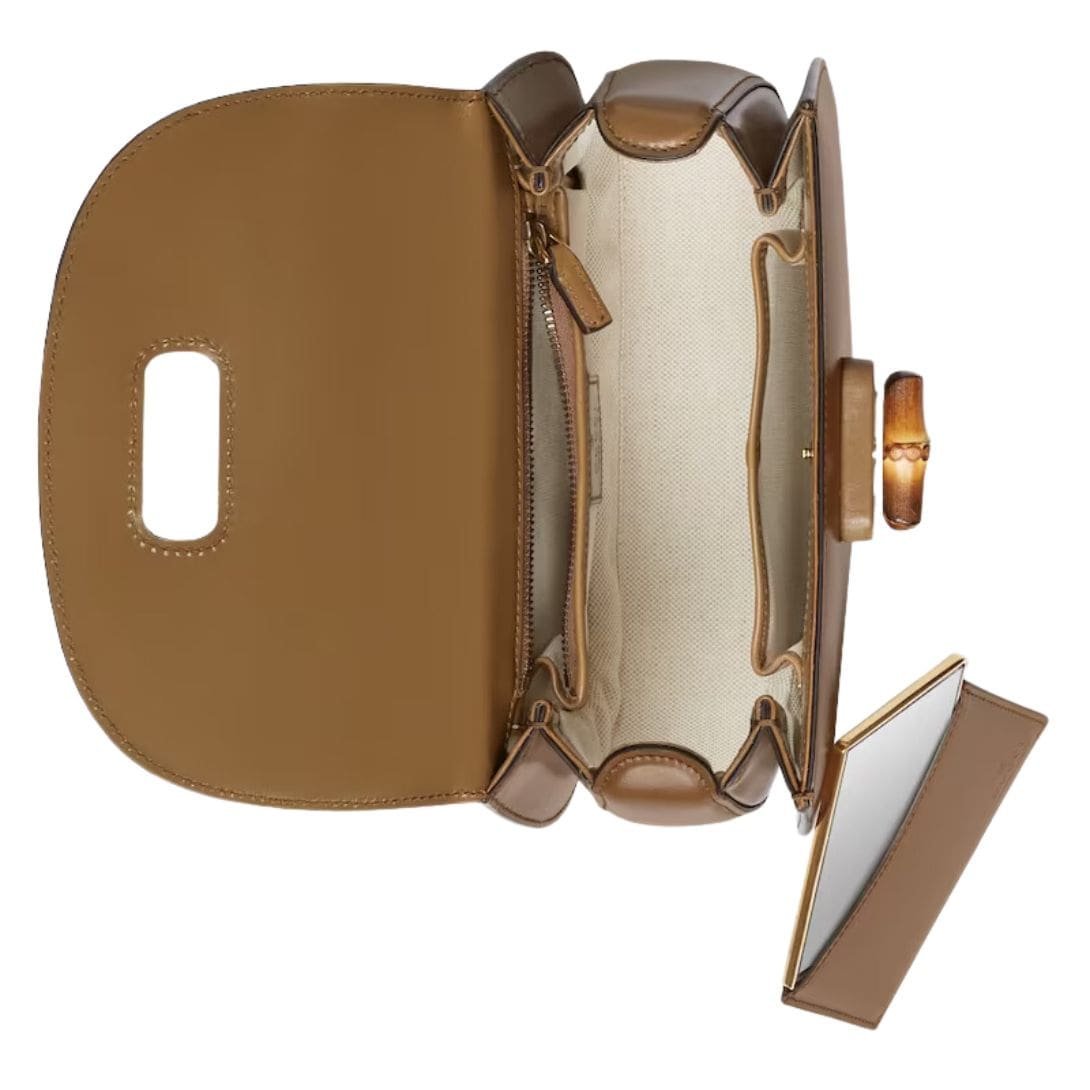 The bag is made from high-quality leather, which provides a luxurious texture and durable finish. Its small size makes it a versatile choice for both formal and casual occasions, while the sleek top handle adds a sophisticated touch. One of the most distinctive features of the Bamboo 1947 is its unique handle, which is crafted from bamboo—an element that pays homage to Gucci’s innovative use of materials and design in the mid-20th century. The bamboo handle is both functional and decorative, offering a chic alternative to traditional leather straps.