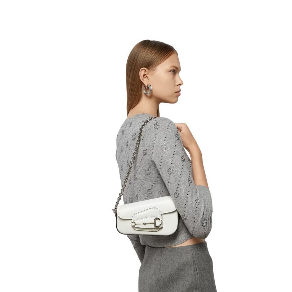 The mini shoulder bag features a sleek, structured silhouette that is both compact and versatile. The pristine white leather is smooth and glossy, accentuated by the gleaming gold-tone Horsebit hardware, which adds a touch of opulence. The iconic Horsebit detail, prominently displayed on the front flap, is a nod to Gucci’s equestrian roots and brings a sense of tradition to the modern design.