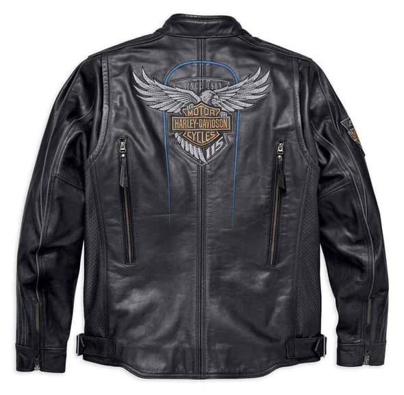 The hints of blue in stitching and contrasting underlay on this Harley Davidson leather jacket complement the design details and colors of our 115th Anniversary motorcycles. The 115th Anniversary Leather Jacket is more than good-looking––it’s road-ready. Midweight buffalo leather. Polyester mesh lining with 115th Anniversary jacquard tape. Two front vertical vents and two back exit vents. Body armor pockets at elbows, shoulders, and back. Buckle waist tabs. One horizontal interior pocket and one zipper vertical interior pocket. Reflective Material piping. 115th Anniversary hardware and studs. 115th Anniversary embroidered leather patch on right sleeve. Embroidered graphics on left chest. 115th Anniversary embroidered and applique graphics on the back. This leather Harley Davidson jacket, Harley Davidson Leather Jackets, leather Harley Davidson jacket, leather jacket Harley Davidson, vintage Harley Davidson leather jacket, men’s Harley Davidson leather jacket, Harley Davidson men’s leather jacket, Harley Davidson vintage leather jacket, vintage leather biker jacket Harley Davidson, Harley Davidson leather jacket for men, and Harley Davidson jacket leather is an essential piece for any rider looking to embody the spirit of the road. Whether you’re cruising through the city streets or hitting the open highway, this Harley Davidson leather jacket will not only keep you protected but also showcase your passion for the iconic brand.