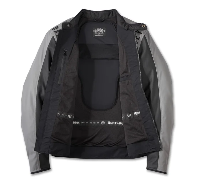 Harley Davidson Men’s 120th Anniversary Imprint Riding Jacket. Bomber styling, legendary motorcycling, and riding comfort were the inspiration behind our Limited Edition 120th Anniversary Imprint Riding Jacket. Built from heavyweight coated nylon to better resist dirt and debris with a cool and comfy mesh lining. Engineered with a boatload of sensible features such as zippered vents, an action back, power-stretch sides, and reflective piping for added visibility. For superior breathability and shock absorption, this men’s riding jacket is equipped with armor at the shoulders and elbows. There’s also plenty of secure pocket space to store essentials while you ride. Our namesake loops around the shoulders while our custom 120th Anniversary branding fills the back for a commemorative Harley-Davidson™ look. See specs for more info, but hurry since quantities of this commemorative style are only here while supplies last.