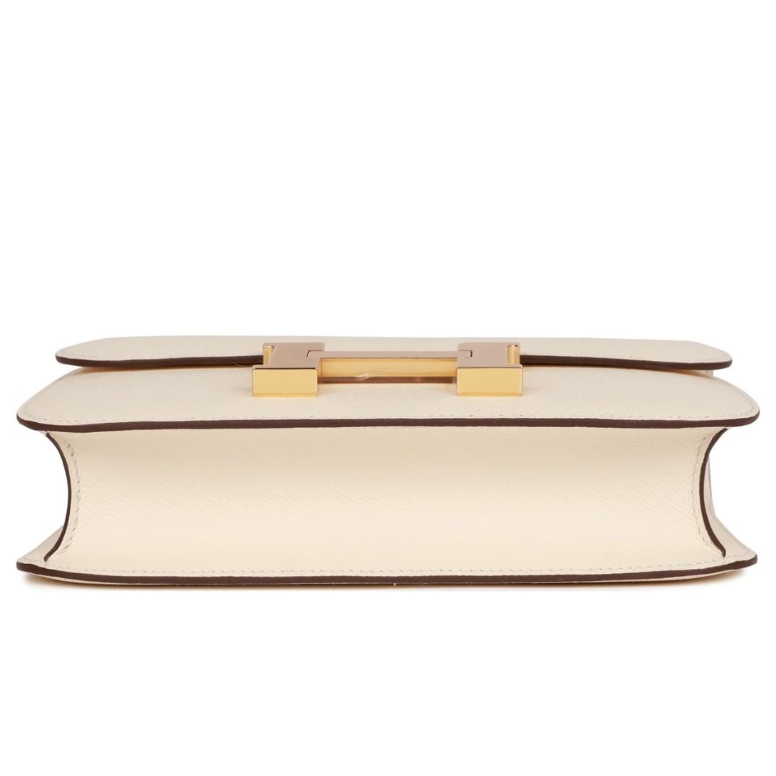 This Hermès Constance is crafted from Nata epsom leather and features gold hardware. It has tonal stitching, a signature metal “H” snap lock closure, and an adjustable shoulder strap, offering a perfect balance of luxury and versatility.