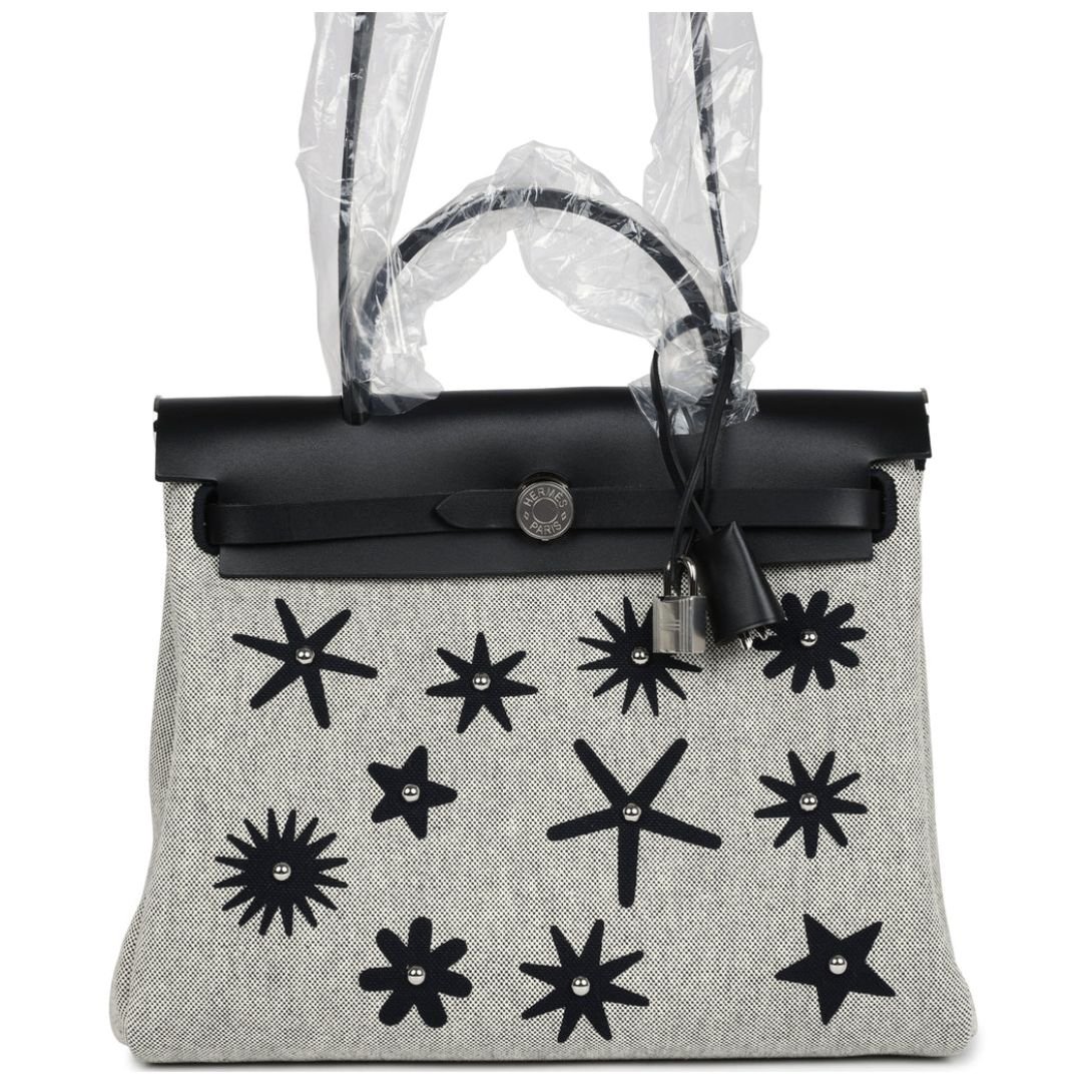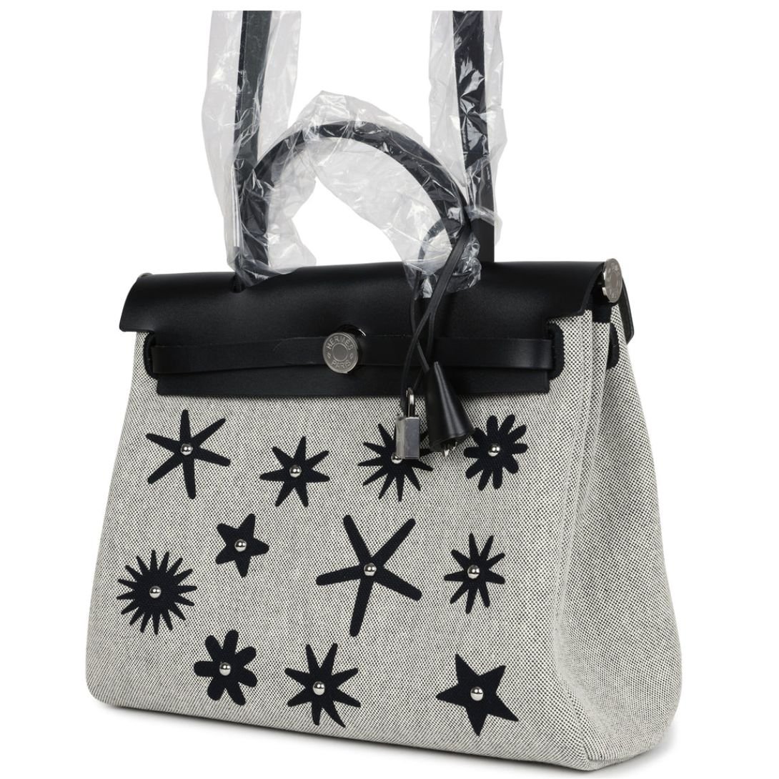 This Limited Edition Hobnailed Herbag Zip 31 PM is made from Black and Ecru Printed H Plume Canvas and Vache Hunter cowhide leather with Palladium hardware. It features tonal stitching and a “Circuit Rider” star motifs print on the front, accented with Palladium studs. The bag also has a clou de selle closure, top handle, shoulder strap in Hunter leather, clochette, an interior zip pouch, and an exterior zip pocket.
