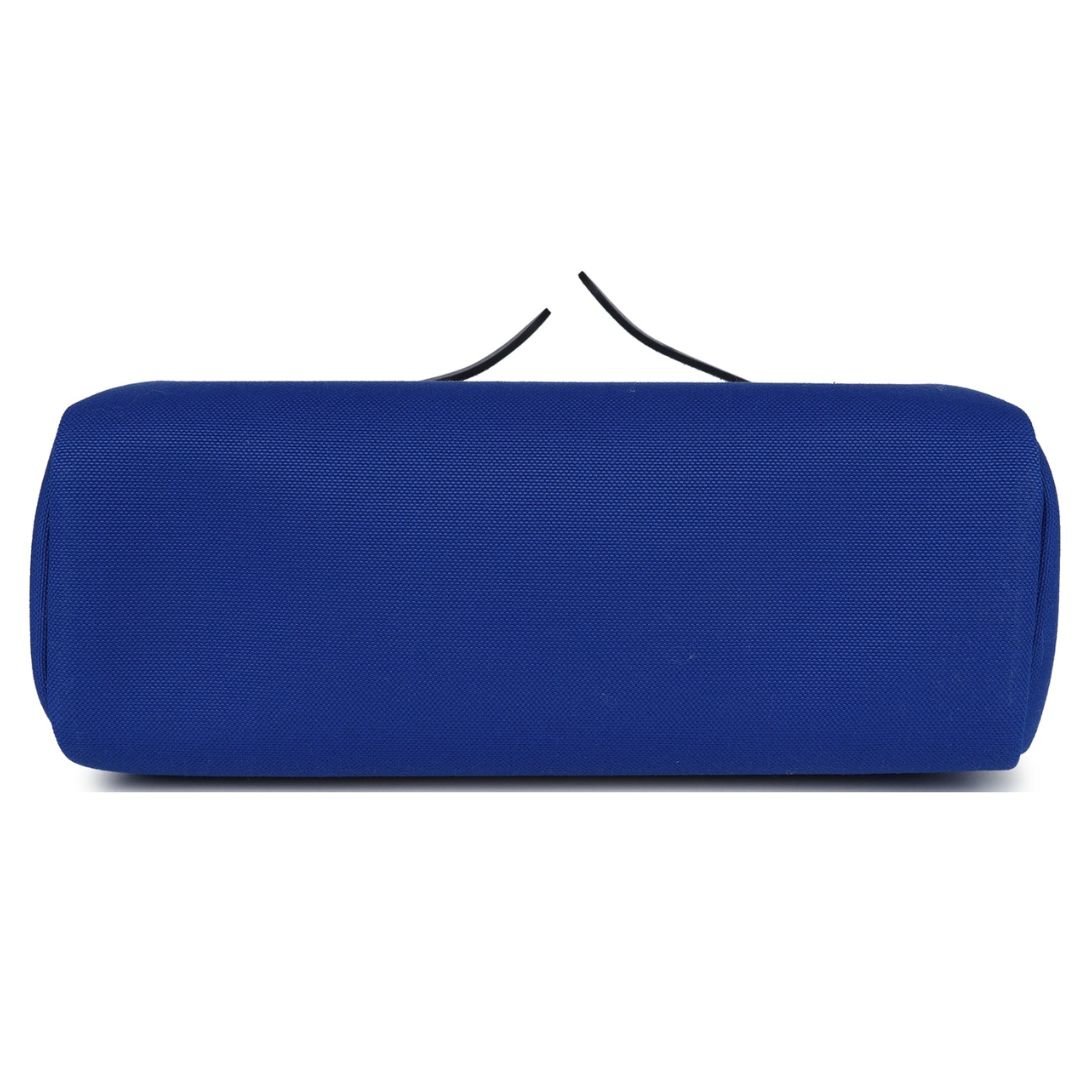 The Hermès Herbag Zip 31 PM is a stylish and versatile bag crafted from Bleu Bill Toile Militaire canvas and Bleu Saphir Vache Hunter leather with palladium hardware. Featuring tonal stitching, this bag includes a front flap with two straps secured by a clou de selle closure, a clochette with a lock and two keys, and a convenient back zip pocket. It also has a single rolled handle and an adjustable shoulder strap, making it both elegant and practical.