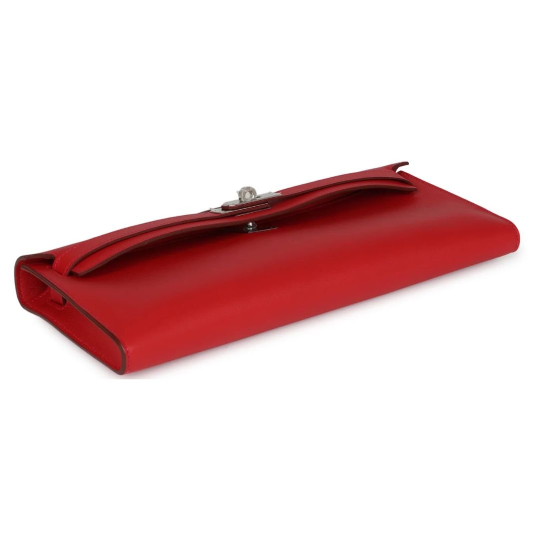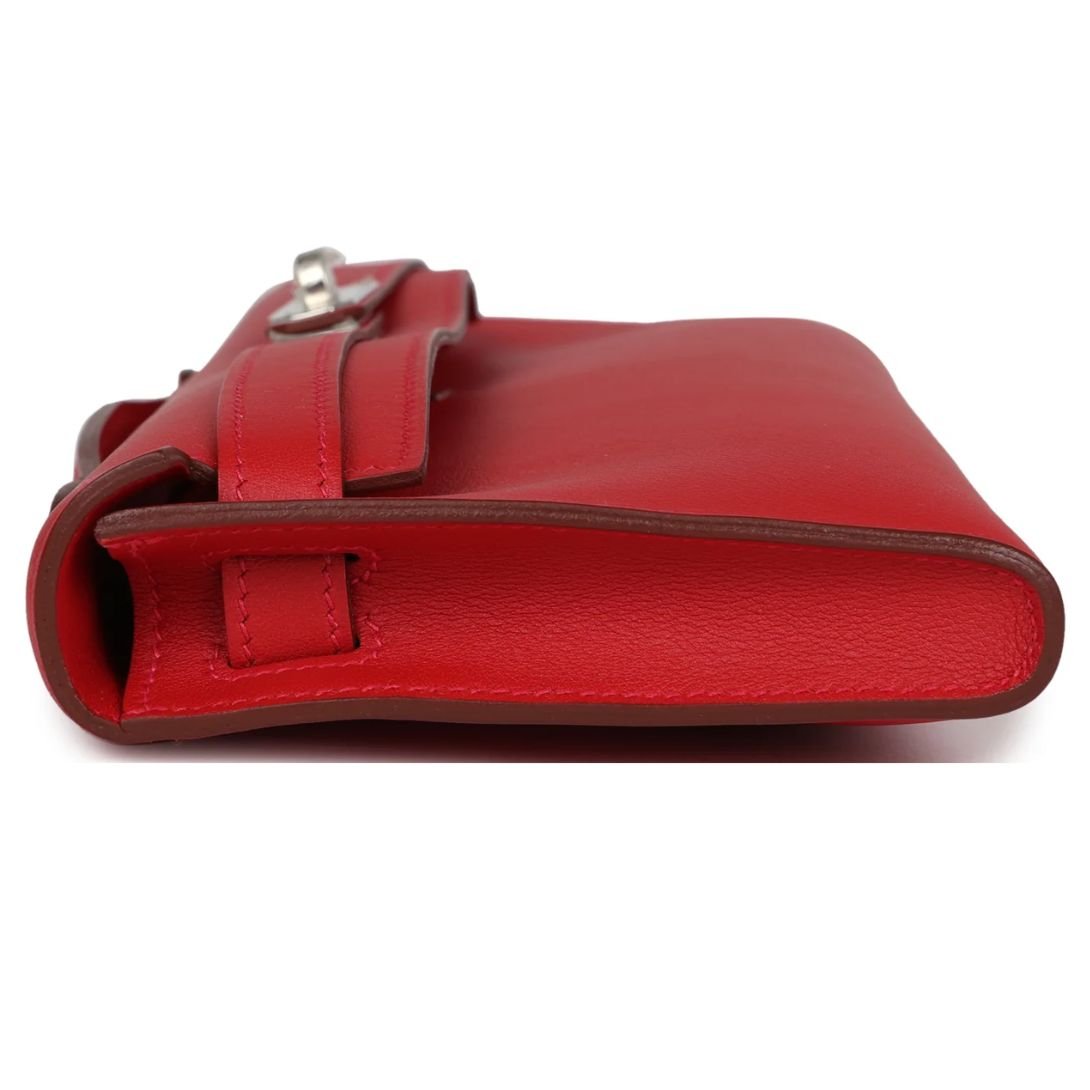 This Hermès Kelly Cut is crafted from luxurious Rouge Casaque swift leather and features palladium hardware with tonal stitching. The bag includes two straps with a front toggle closure and a flat top handle, giving it a sleek and sophisticated look.