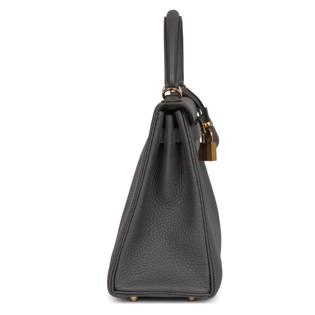This Hermès Kelly, in the Retourne style, is crafted from Etain Togo leather with gold hardware, showcasing timeless elegance. The bag features tonal stitching, a front flap with two straps and a center toggle closure, a clochette with a lock and two keys, a single rolled handle, and an optional shoulder strap for versatility.