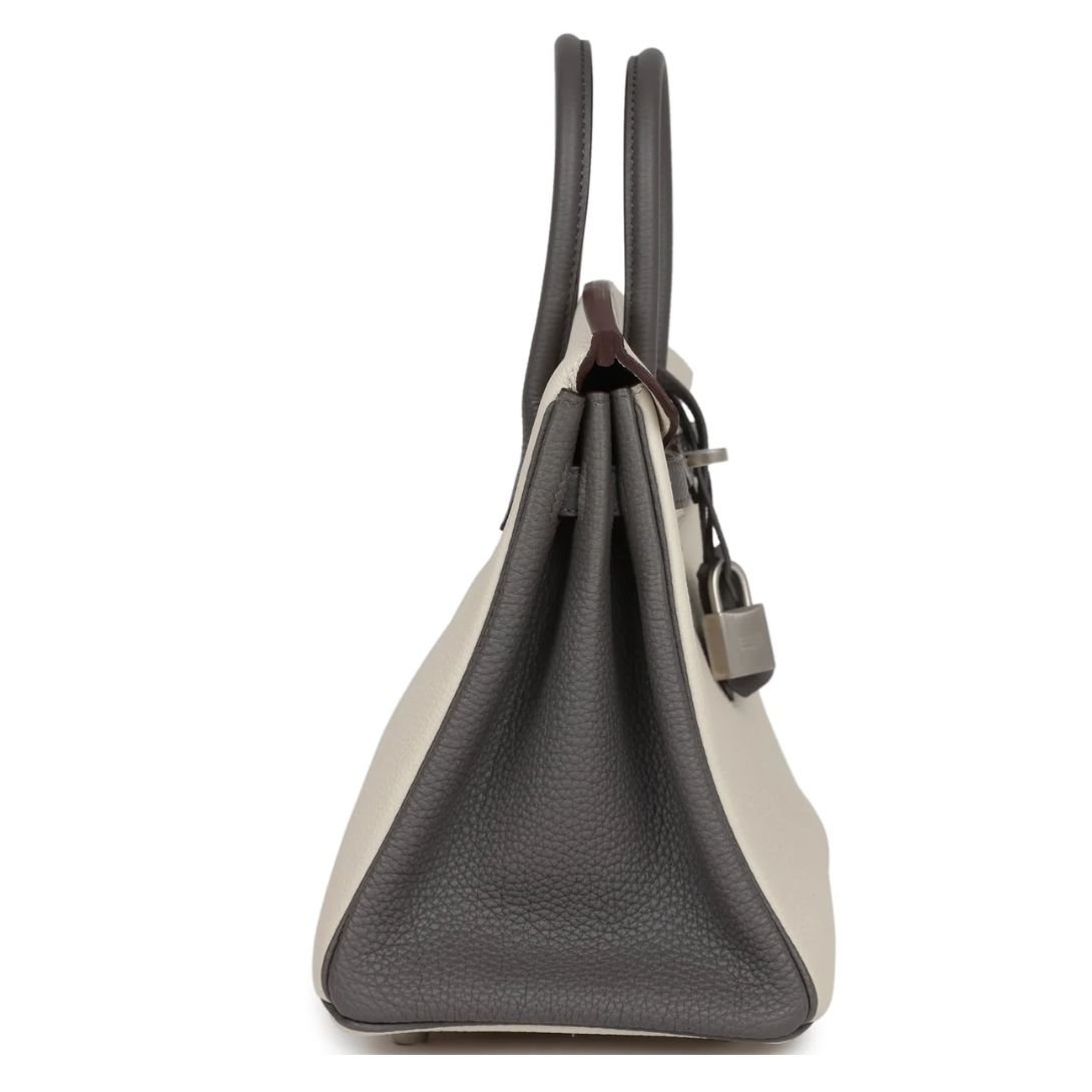 This Special Order Hermès Birkin is crafted from a sophisticated combination of Beton and Etain togo leather with brushed palladium hardware. The bag features contrast stitching, a front flap, two straps with a center toggle closure, a clochette with a lock and two keys, and double rolled handles, combining classic elegance with practical design.