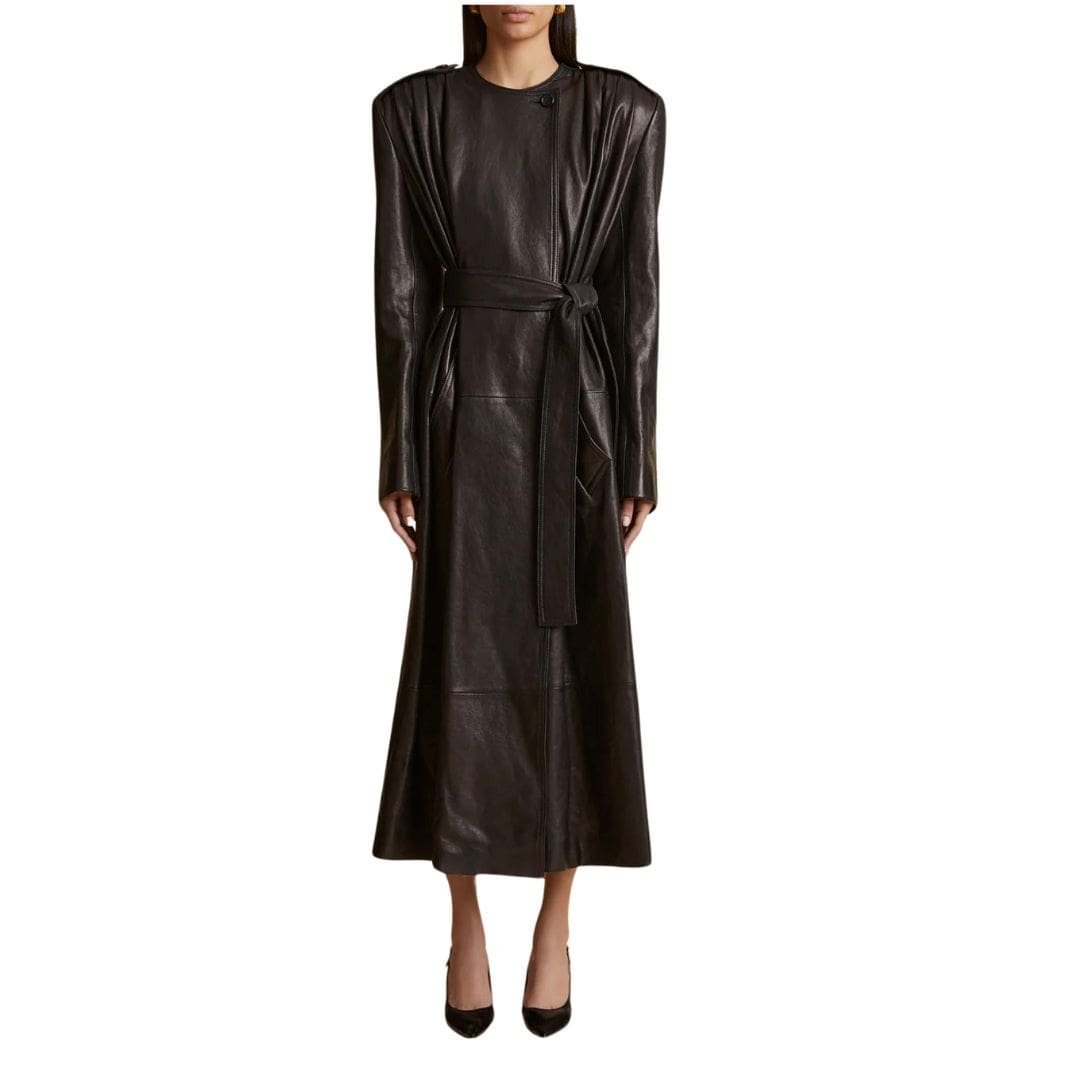 The Khaite Minnler Trench in black leather epitomizes timeless sophistication with a contemporary edge. Crafted with precision and finesse, this iconic piece seamlessly merges classic trench coat elements with avant-garde design principles, creating a garment that is both striking and versatile.KHAITE THE MINNLER TRENCH IN BLACK LEATHER