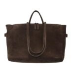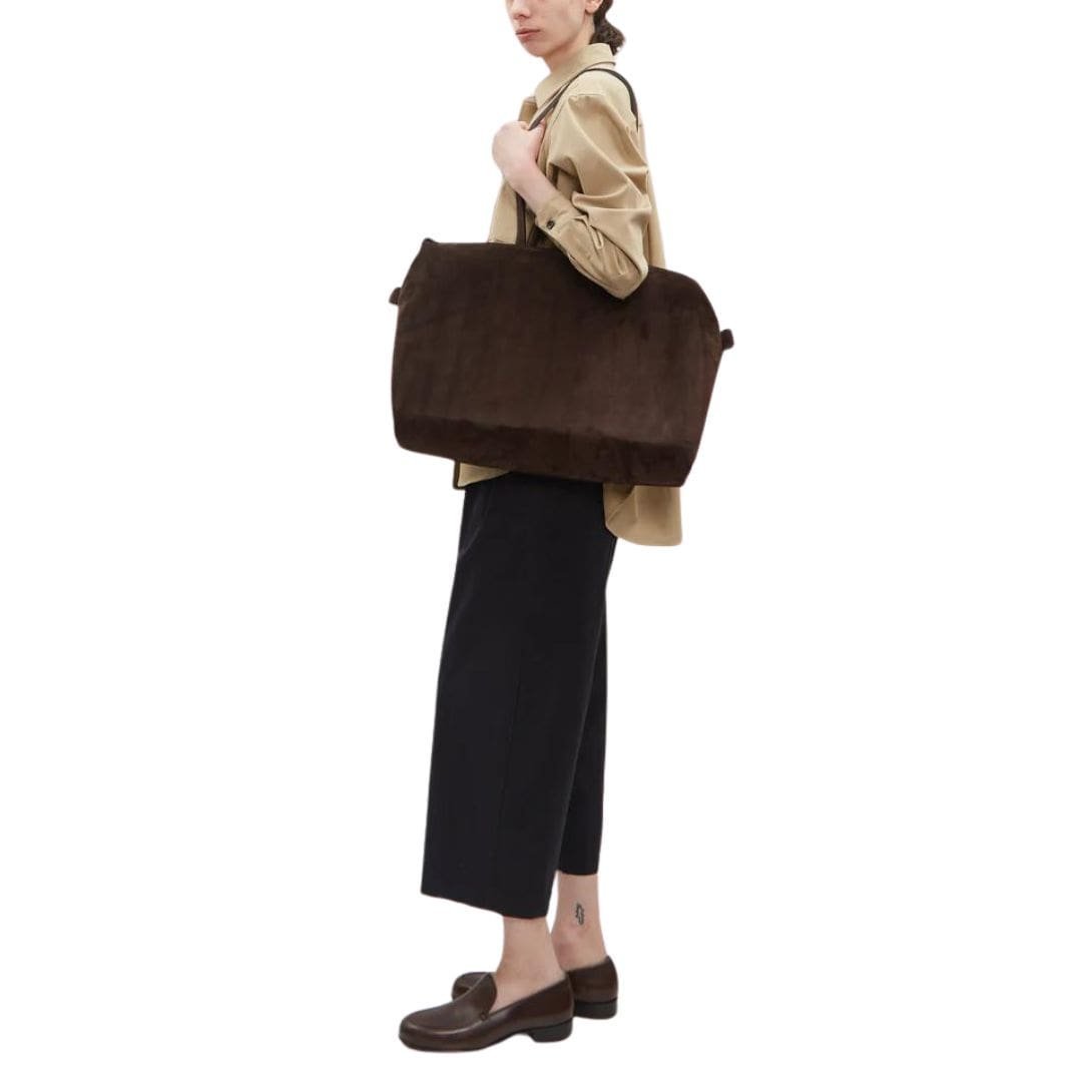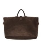 Marsèll presents its signature top-handle La Garconne Marsèll 4 in Orizontalle Bag in dark brown suede leather, featuring cinch-able sides for adjustable shape and multiple carrying options. The bag has a top zip closure and side snaps. Inside, it includes flap pockets and leather patch pockets atop a zip pocket. An optional crossbody strap is also included.