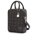 Loewe Amazona 15 Bag In Anagram Jacquard And Calfskin sophisticated accessory, presented in a chic anthracite and black color scheme, is crafted from a luxurious combination of jacquard and calf leather. The blend of materials not only enhances its aesthetic appeal but also ensures durability and a refined texture.