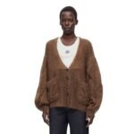 Loewe’s craftsmanship is evident in the cardigan’s design, which features the brand’s distinctive anagram pattern. This creative touch adds a unique flair to the garment, blending classic sophistication with modern aesthetics. The combination of mohair and polyamide not only ensures comfort and durability but also enhances the cardigan’s visual appeal, making it a standout piece in any wardrobe.
