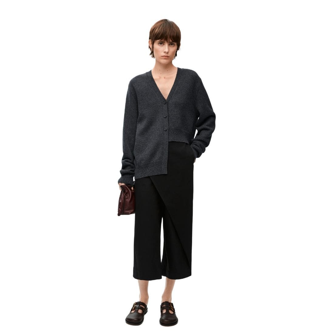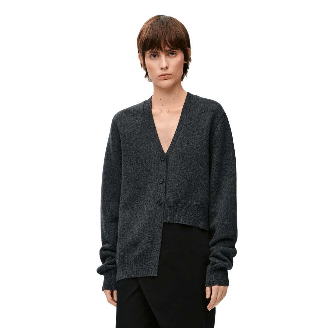 In summary, the Loewe asymmetric cashmere cardigan represents the epitome of refined luxury and modern design. Its premium cashmere composition, combined with an asymmetric silhouette and attention to detail, ensures it stands out as a timeless piece in any discerning wardrobe, offering unparalleled comfort and style.