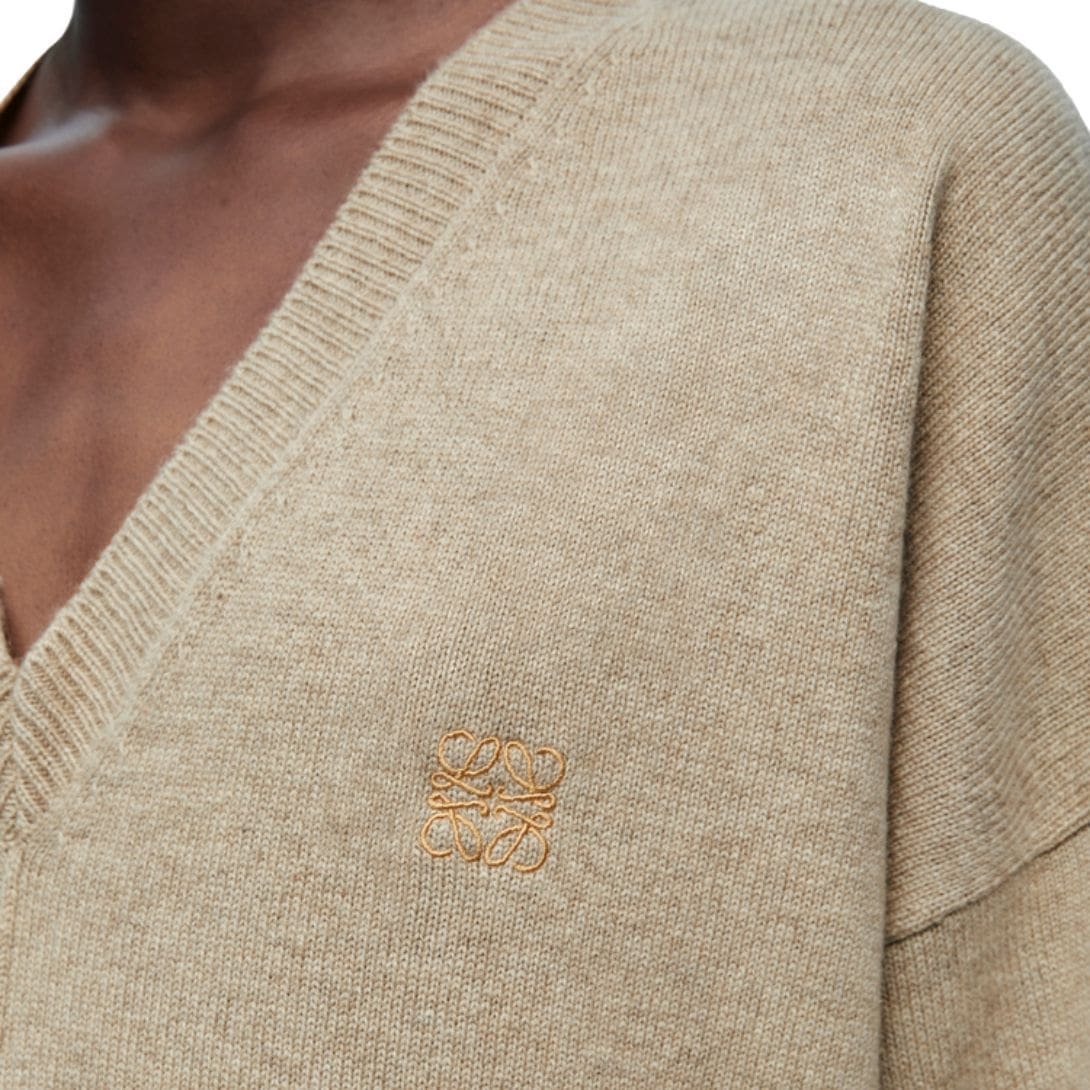 Loewe Asymmetric Cashmere sweater is crafted from premium cashmere, renowned for its unparalleled softness, warmth, and luxury. Cashmere, sourced from the fine undercoat fibers of cashmere goats, is celebrated for its lightweight yet insulating properties, making it a coveted material for high-quality garments.