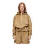 Loewe’s craftsmanship is evident in every detail of the draped suede hoodie, from the precision of the stitching to the quality of the suede itself. The design may feature a hood for added warmth and style, complemented by practical elements such as pockets and adjustable closures, enhancing both functionality and aesthetics.