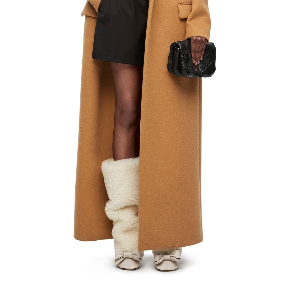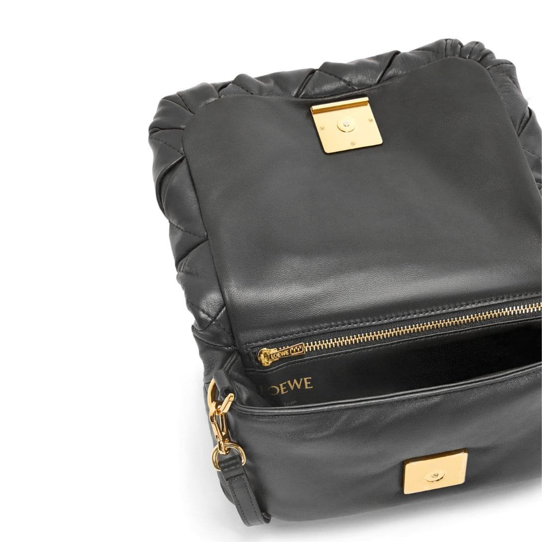 The LOEWE Goya Puffer Mini Bag In Shiny Lambskin is a chic and sophisticated accessory, crafted from polished calf nappa leather. This premium material provides a sleek, shiny finish that exudes elegance and durability, making it a standout piece in any wardrobe.