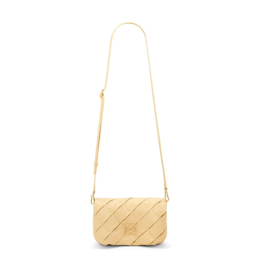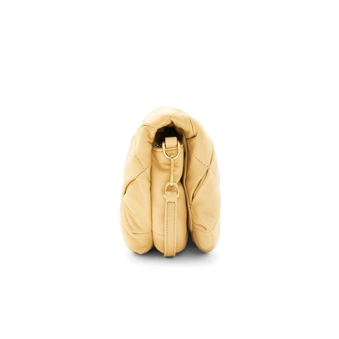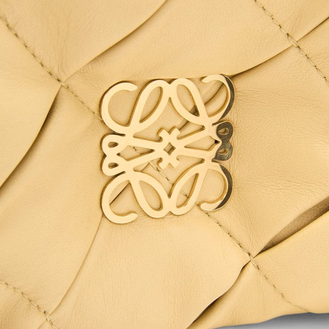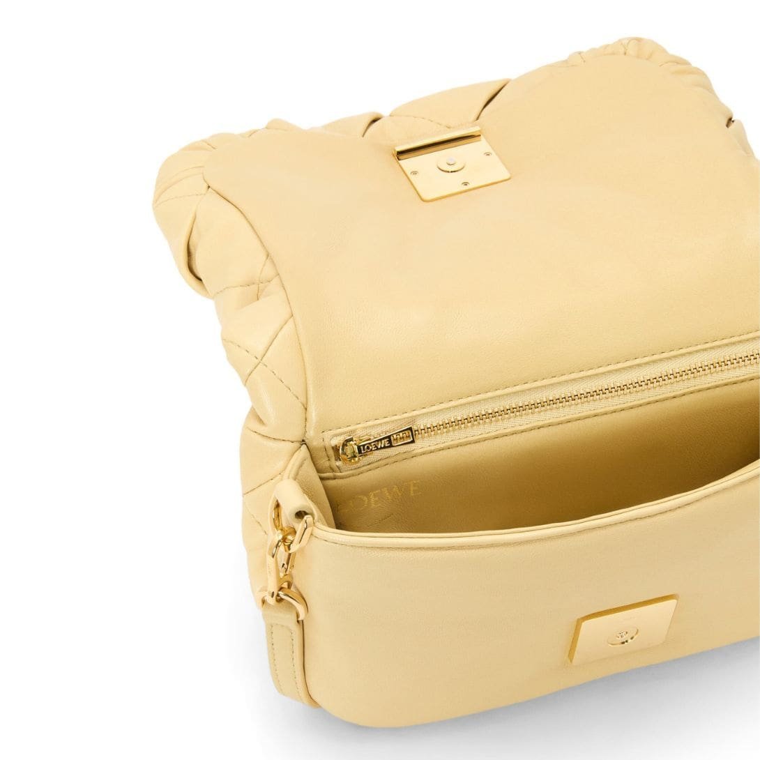 The LOEWE Goya Puffer Mini Bag In Shiny Lambskin is a chic and sophisticated accessory, crafted from polished calf nappa leather. This premium material provides a sleek, shiny finish that exudes elegance and durability, making it a standout piece in any wardrobe.