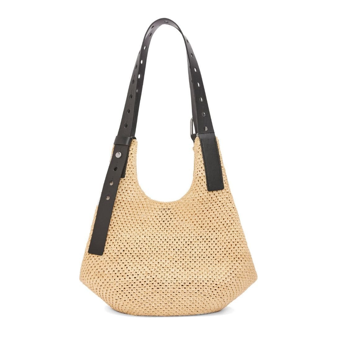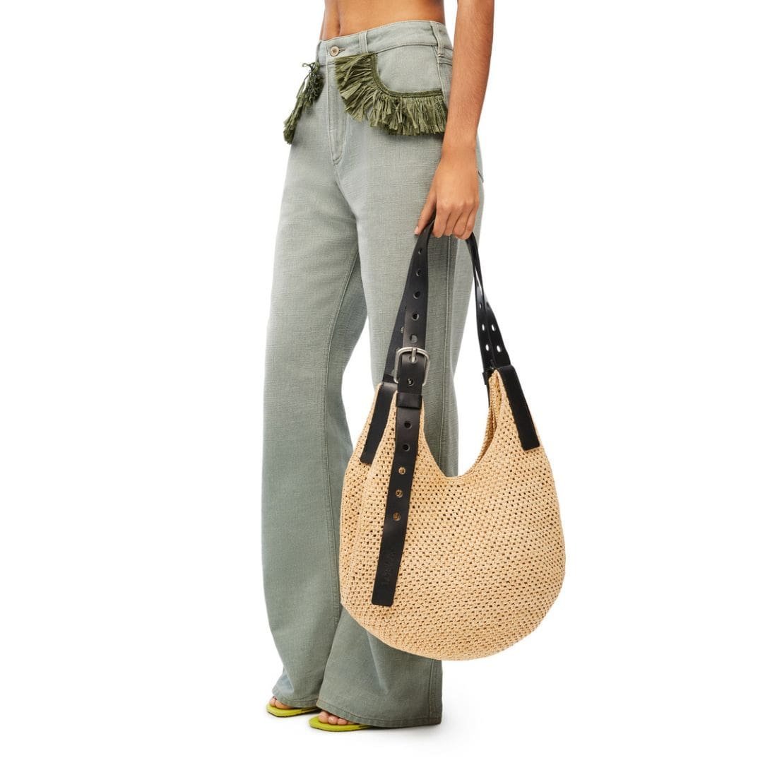 Introducing the striking LOEWE Hobo Bag In Raffia And Calfskin, blending natural raffia with bold black accents for a chic contrast. Enhanced with palladium metallic details, it’s a fusion of sophistication and nature.