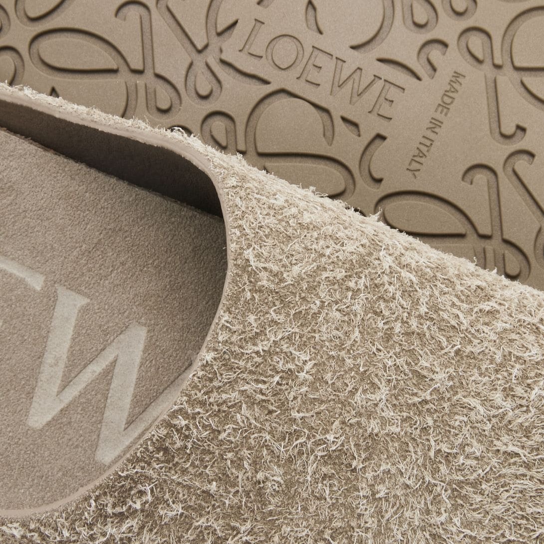 The silhouette of the sandal is sleek and streamlined, featuring a wide strap across the vamp adorned with the signature LOEWE anagram embossed subtly. This detail adds a touch of elegance without overwhelming the overall minimalist design. The strap not only serves an aesthetic purpose but also provides stability and support, making these sandals suitable for both casual outings and more formal occasions. LOEWE LAGO SANDAL IN BRUSHED SUEDE