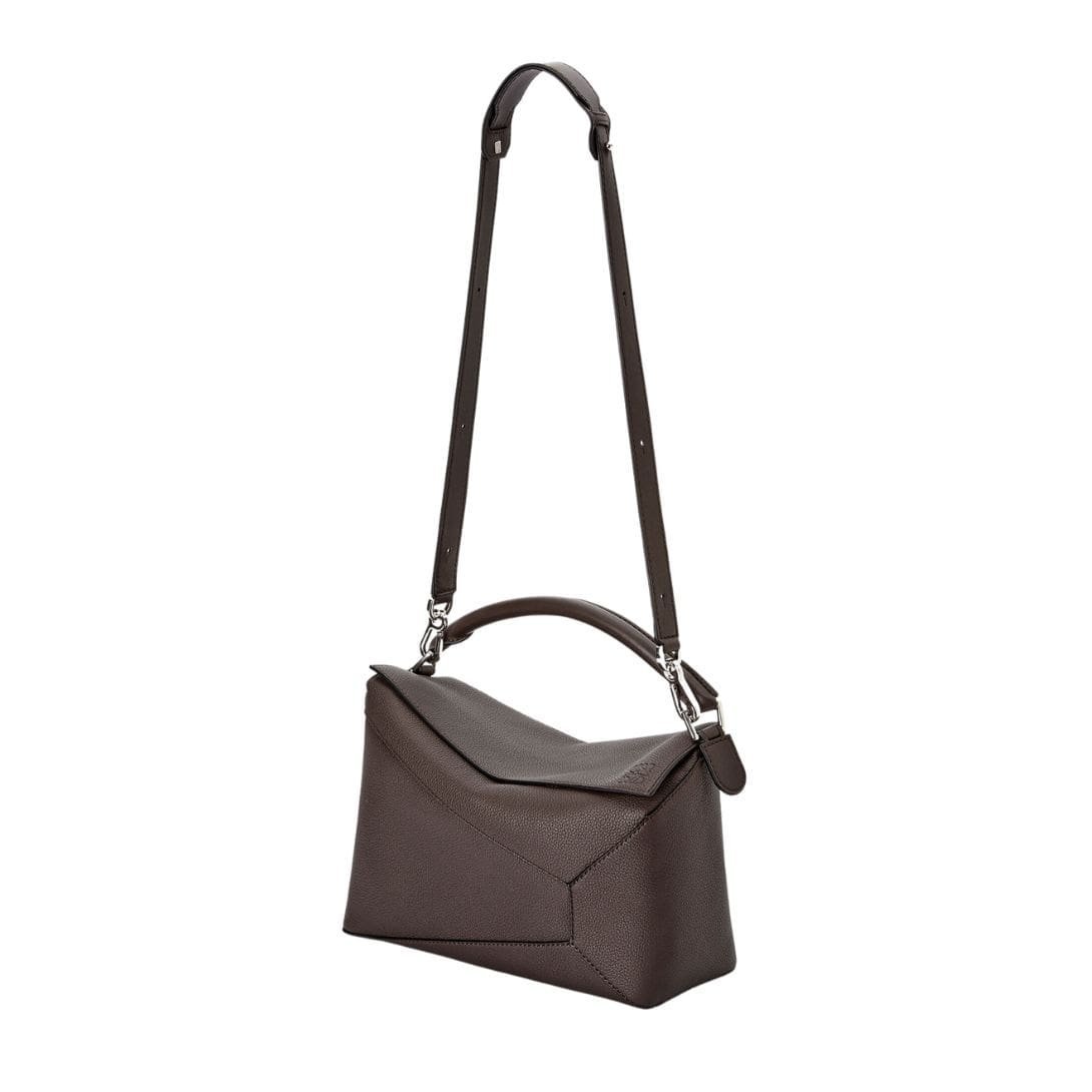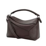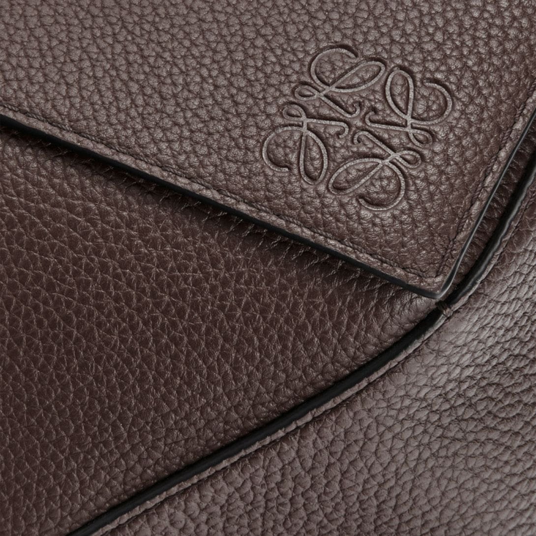 The LOEWE Large Puzzle Bag in grained calfskin exemplifies luxury and innovation with its distinctive design and premium craftsmanship. This iconic bag, celebrated for its geometric shape, merges functionality with high fashion. Crafted from grained calfskin, the bag’s textured surface not only enhances durability but also exudes a sophisticated, tactile elegance.