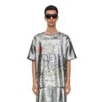 Crafted from high-quality materials, the shirt’s main fabric is a soft, breathable cotton blend, providing a comfortable base that is gentle against the skin. However, the standout feature of this T-shirt is its intricate sequin embellishment. The sequins are meticulously hand-applied, covering the entire surface of the garment. They shimmer and sparkle with every movement, creating a dynamic, glamorous effect that catches the light from every angle. This dazzling display elevates the T-shirt from a simple wardrobe staple to a statement piece.