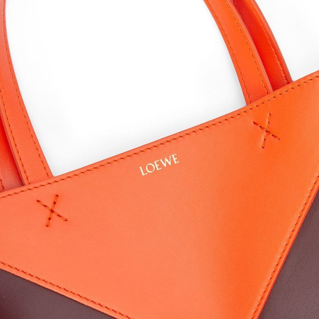 Introducing the LOEWE Puzzle Fold Tote Mini Bag In Shiny Calfskin, a compact yet elegant accessory designed for those who appreciate both style and functionality. Crafted from polished calf leather, this bag exudes sophistication and luxury, making it an ideal choice for any fashion-forward individual.