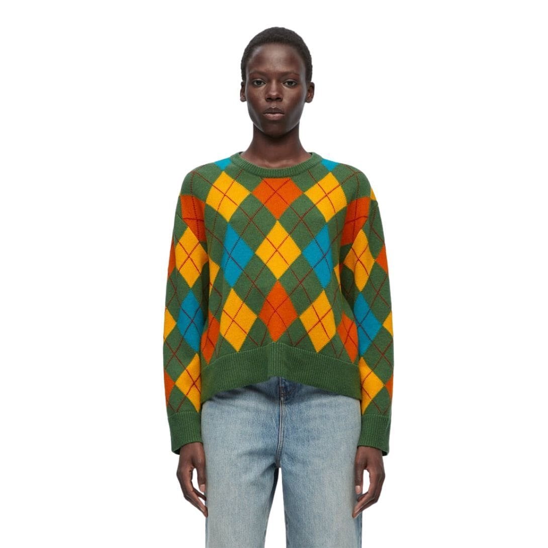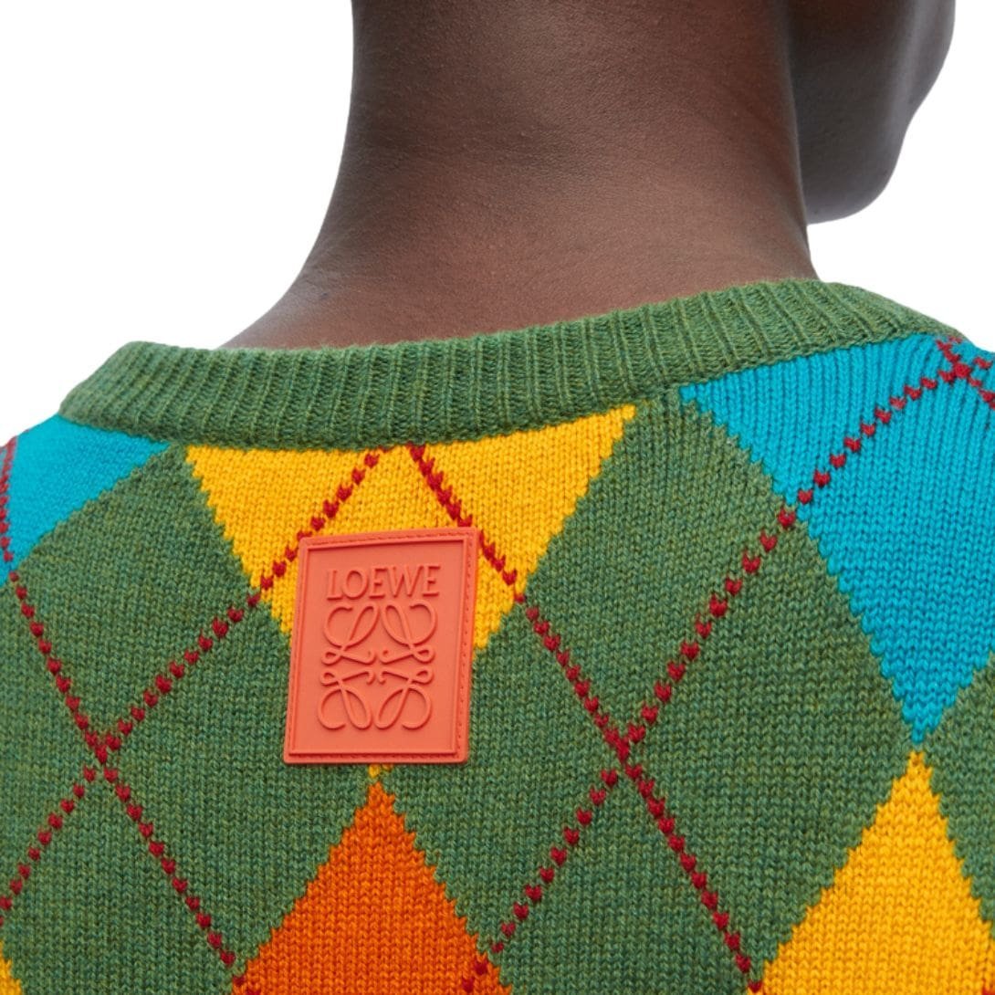 Loewe’s dedication to craftsmanship is evident in the intricate diamond pattern and fine detailing of this sweater. The pattern adds a touch of visual interest and texture, elevating the sweater’s design while maintaining its classic aesthetic. Meticulous stitching and a refined finish underscore the brand’s commitment to creating high-quality, timeless pieces.