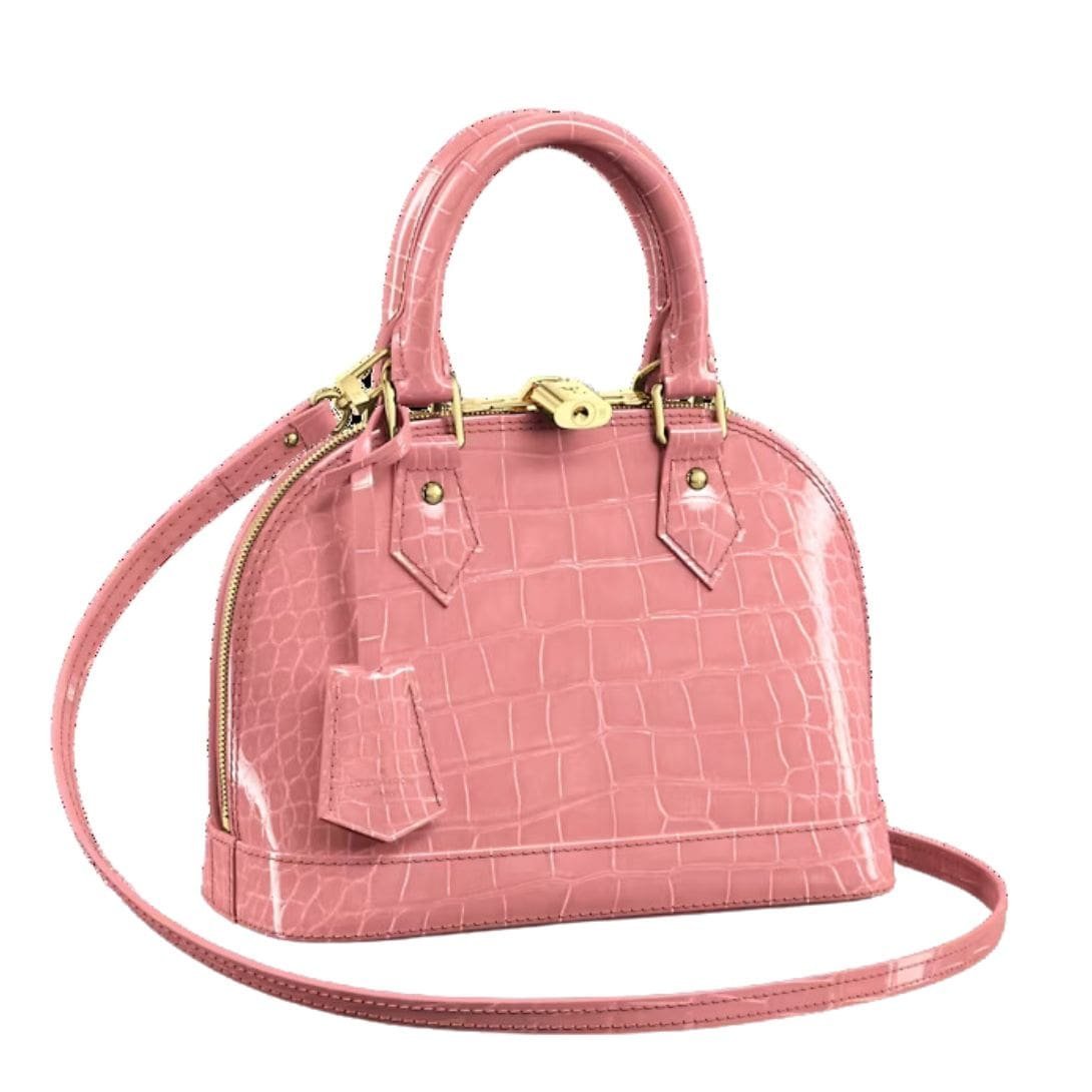 Radiating sophistication in Rose Tourmaline Pink, the LOUIS VUITTON ALMA BB exudes an aura of timeless grace. Its exterior boasts brilliant alligator leather, meticulously selected and expertly crafted to create a mesmerizing texture that captivates the eye. Enhanced with matching alligator leather trim, every detail of this bag speaks to its opulent allure.