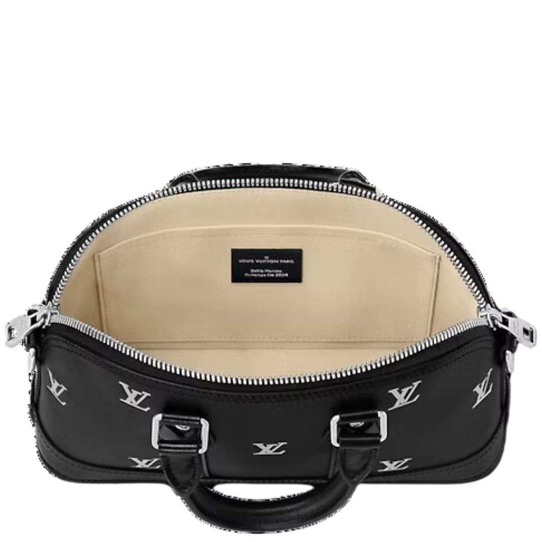 Measuring 12.2 x 7.1 x 4.3 inches, the LOUIS VUITTON ALMA EAST WEST epitomizes compact sophistication. Its sleek rectangular silhouette, adorned with silver LVs embossed and printed on fine-grained black leather, exudes modernity and style. Enhanced with calfskin trim and silver-color hardware, every detail reflects the meticulous craftsmanship synonymous with Louis Vuitton.