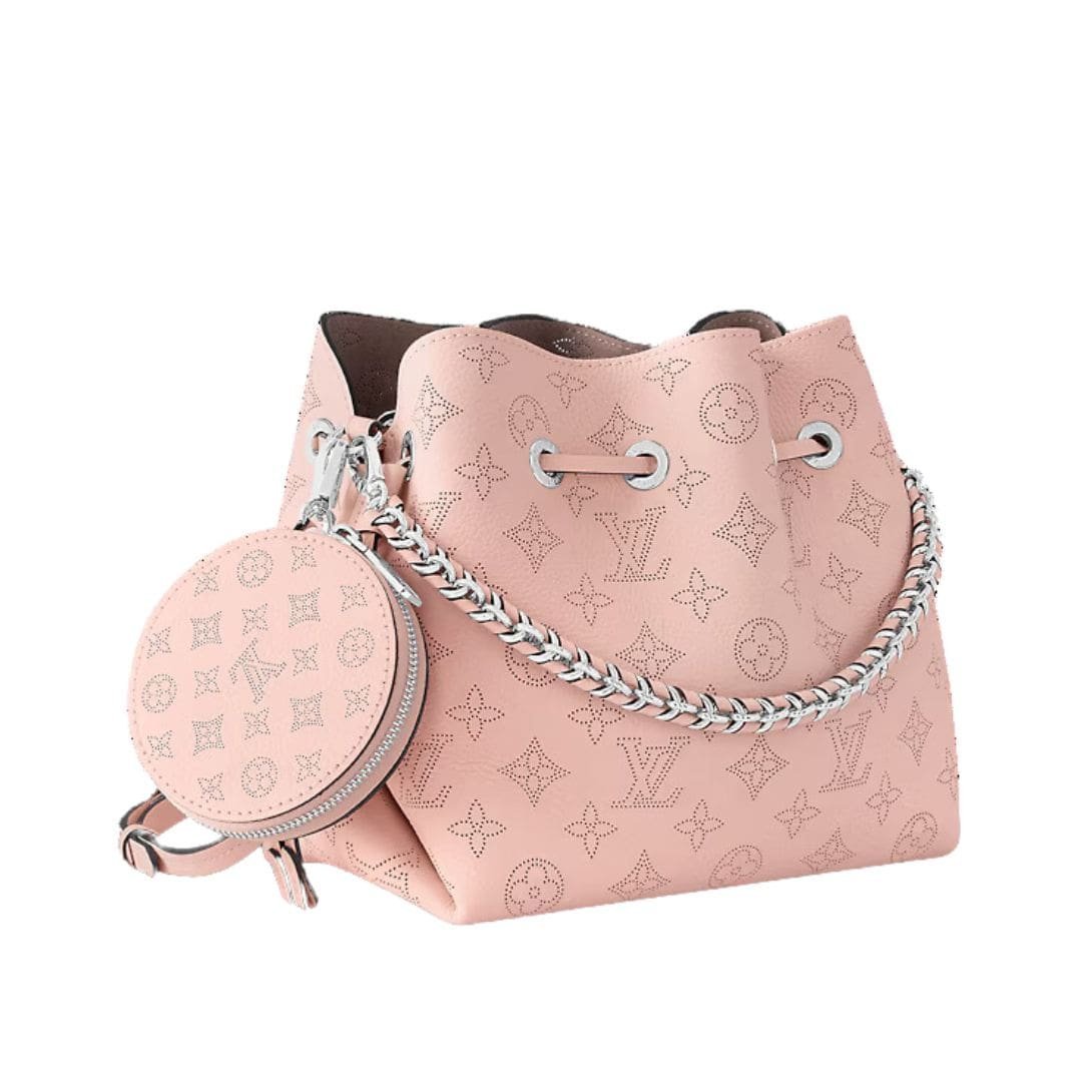 Embrace a delightful fusion of freshness and femininity with the charming LOUIS VUITTON BELLA bucket bag, radiating elegance in a captivating Rose Jasmin hue. Crafted from exquisite Mahina perforated calfskin leather, this adorable accessory is a true testament to sophistication and style.