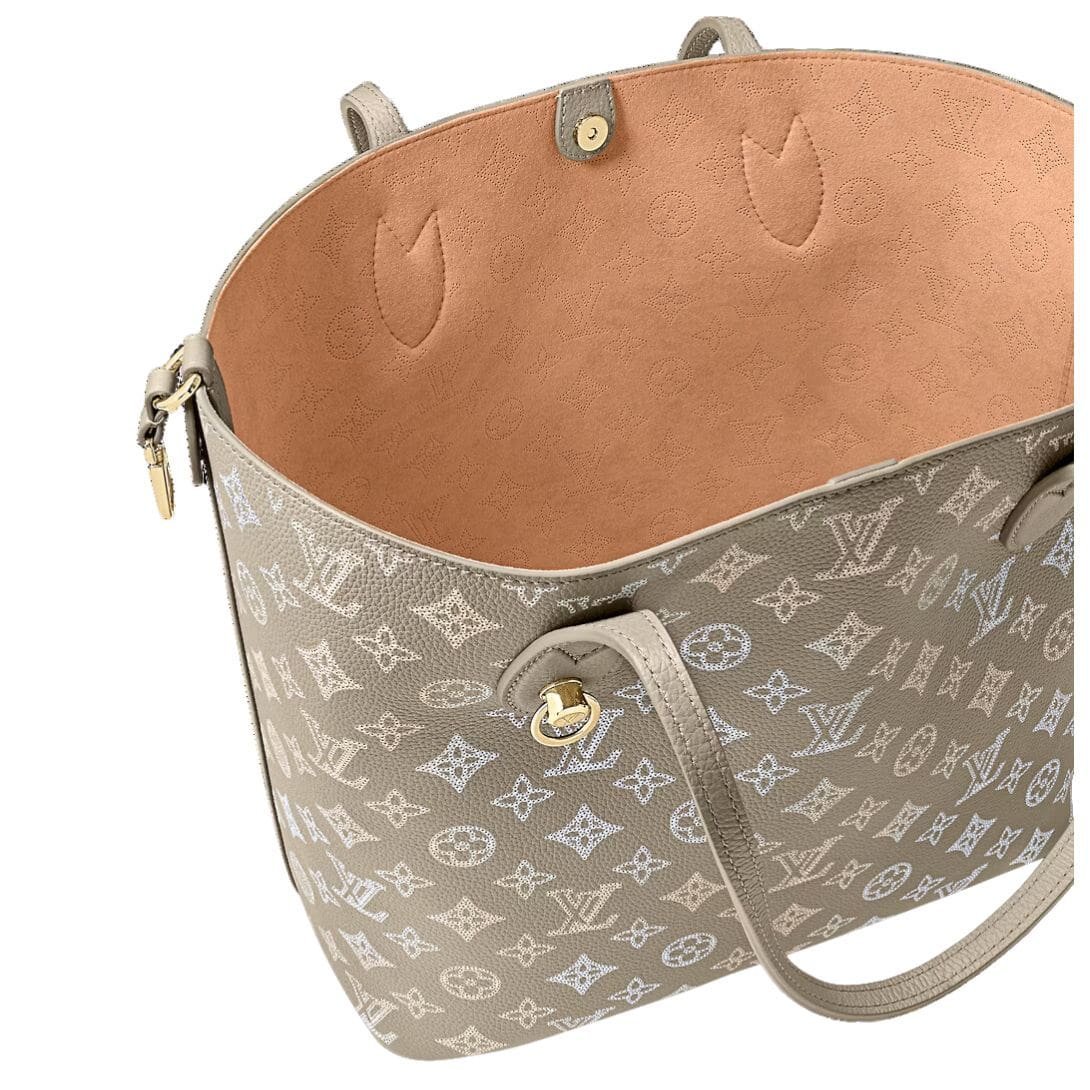 Introducing the LOUIS VUITTON BLOSSOM MM tote bag, a testament to Louis Vuitton’s commitment to luxury craftsmanship and environmental responsibility. Crafted from exquisite Mahina calfskin, this bag features the iconic Monogram pattern perforated into elegant gray leather, marrying timeless style with modern sophistication.