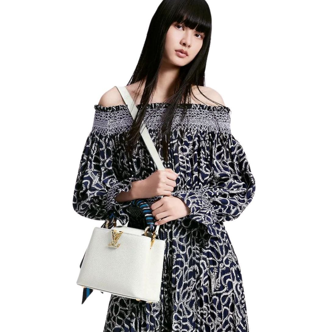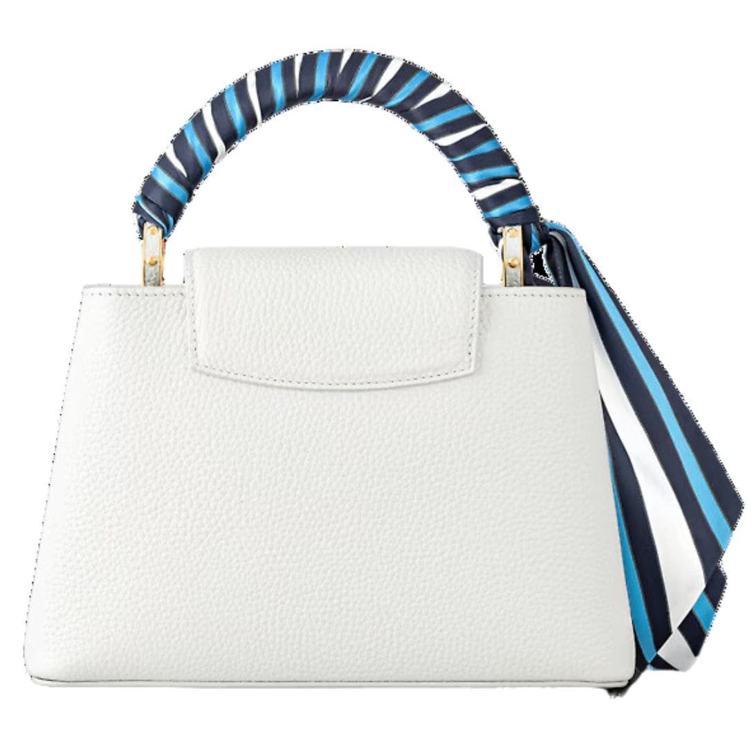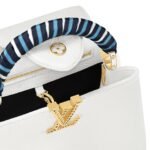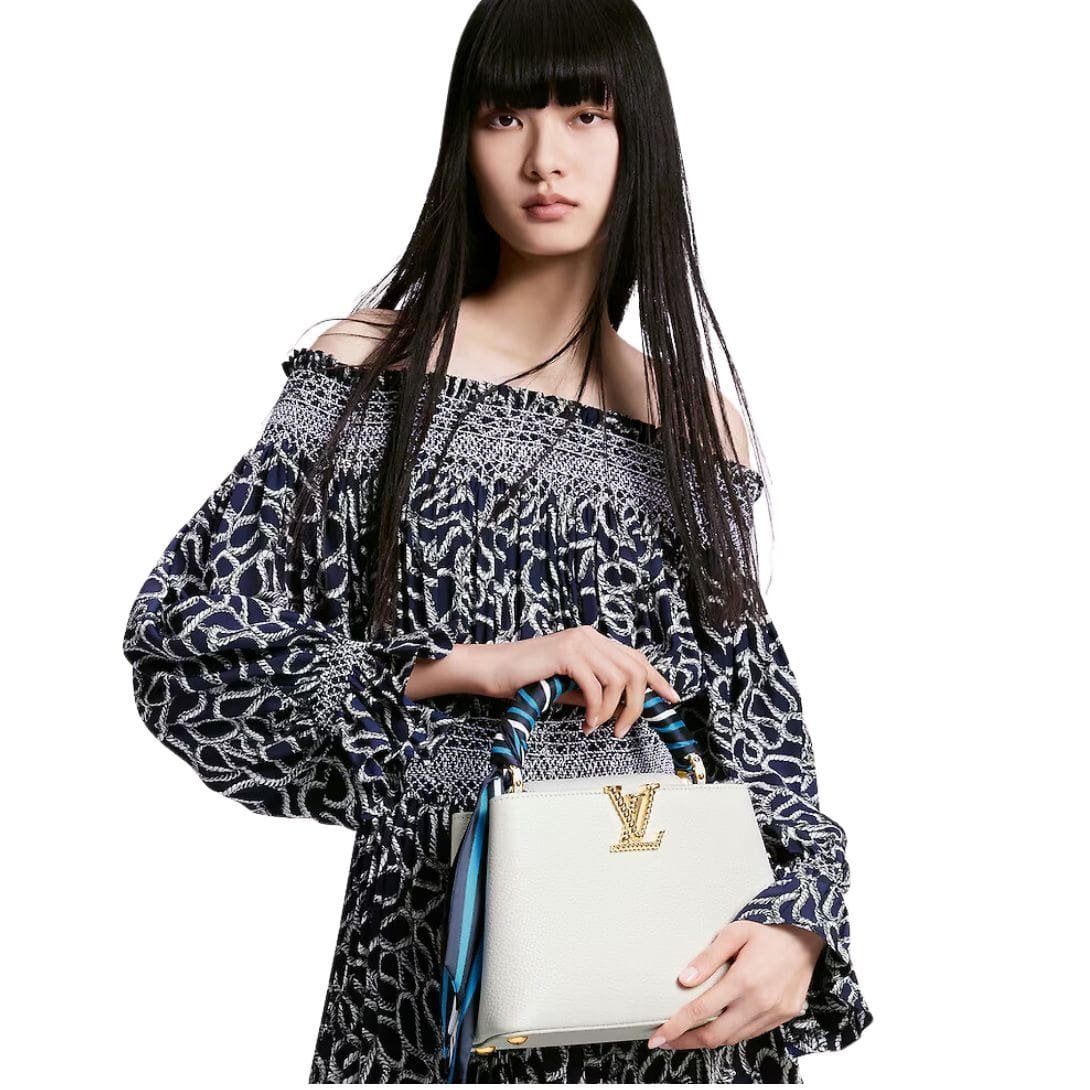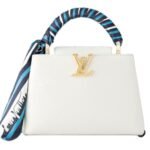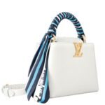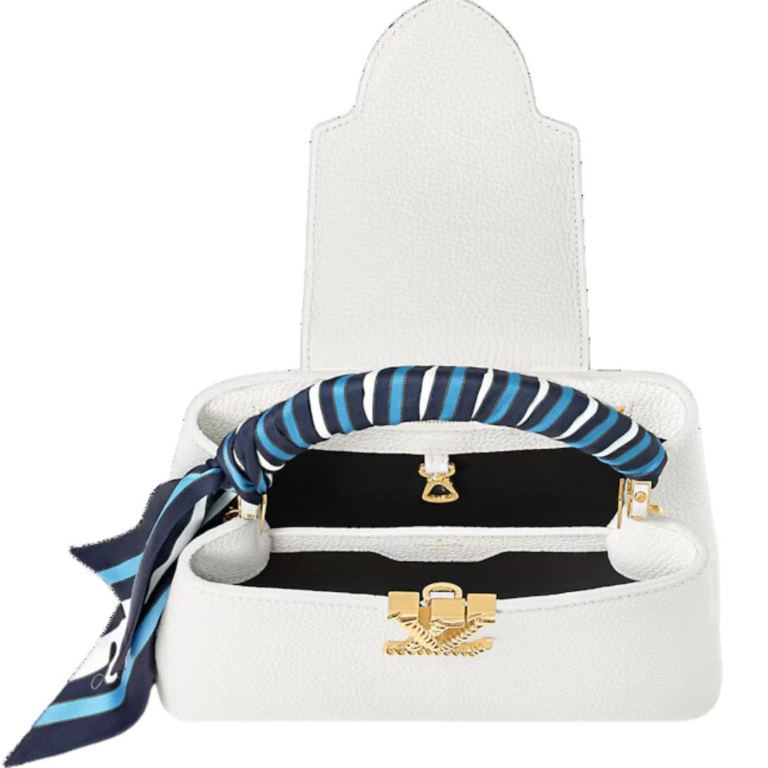 Part of the Nautical Collection, the LOUIS VUITTON CAPUCINES BB handbag is a stunning embodiment of Louis Vuitton’s craftsmanship and style. Fashioned from luxurious Taurillon leather, it features gold-color LV Initials designed to resemble boat chains, adding a unique marine-inspired touch. The top handle is adorned with a decorative scarf in shades of ocean blue, enhancing the nautical theme and adding a vibrant accent.