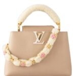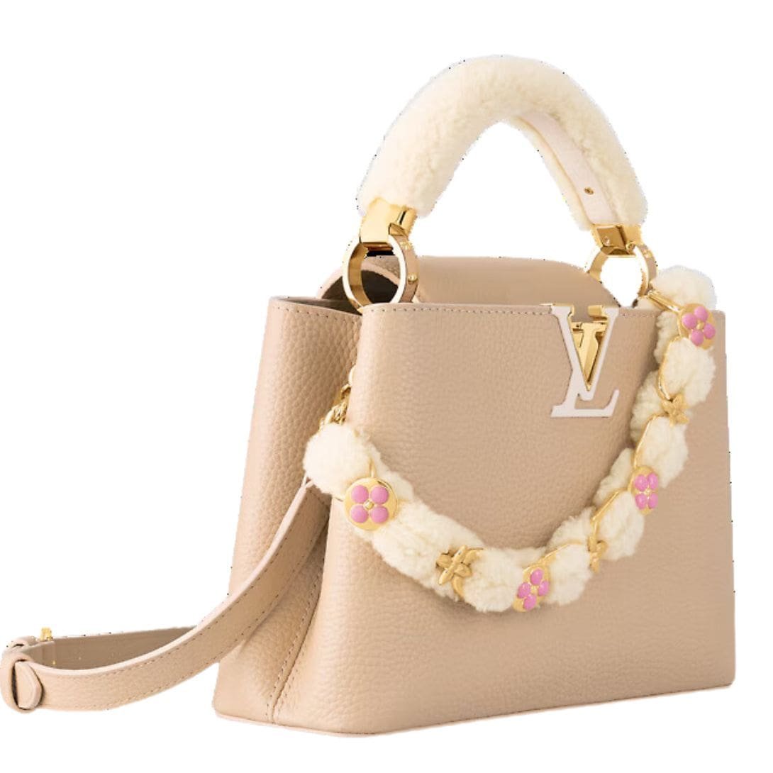 Introducing the wintry edition of the LOUIS VUITTON CAPUCINES BB handbag, a luxurious accessory that blends functionality with seasonal elegance. Crafted from rich Taurillon leather, this handbag features a cozy shearling top handle that adds a touch of winter charm. The decorative chain, interlaced with shearling and adorned with Monogram Blossoms made of enamel and gold-color metal, is both stylish and removable. Complementing the chain is a thin, adjustable strap, also removable, offering versatile carry options.