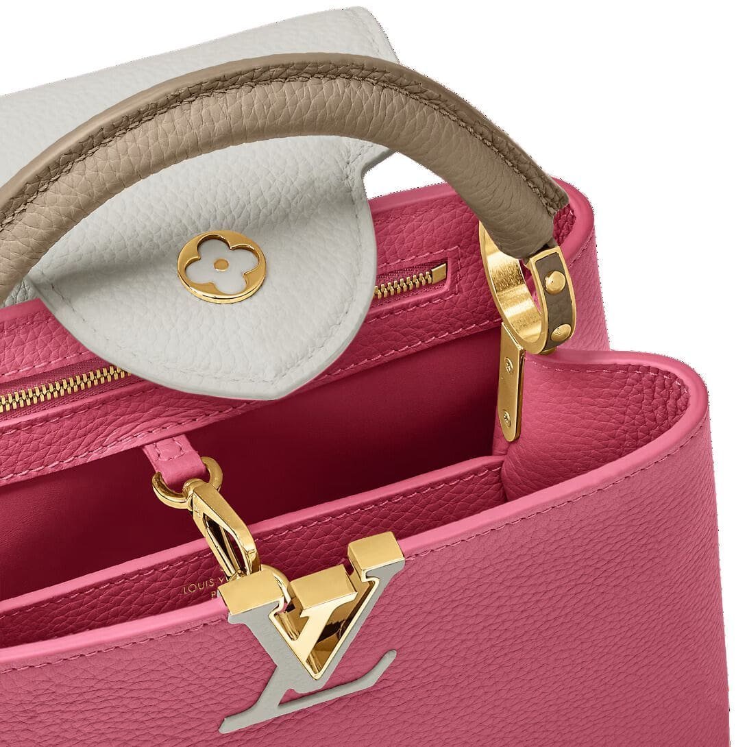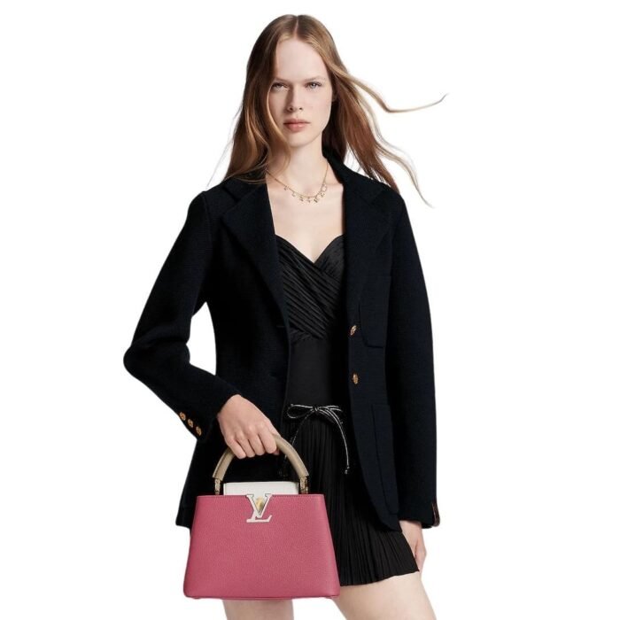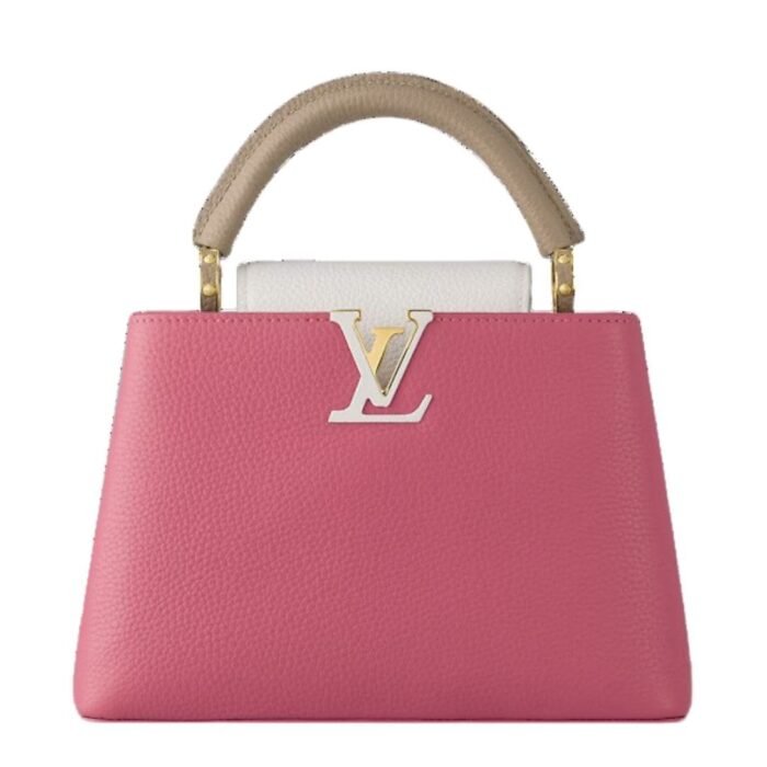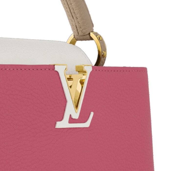 Introducing the LOUIS VUITTON CAPUCINES BB handbag, a bold statement piece crafted from luxurious full-grain Taurillon leather. Featuring a striking trio of colors—Rose Asnieres Pink, Snow White, and Galet Gray—this handbag exudes modern elegance and sophistication. The structured lines of the bag perfectly complement the gentle curve of its single top handle, creating a harmonious balance of form and function.