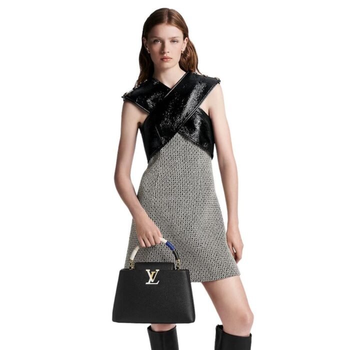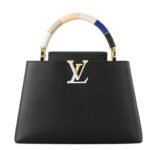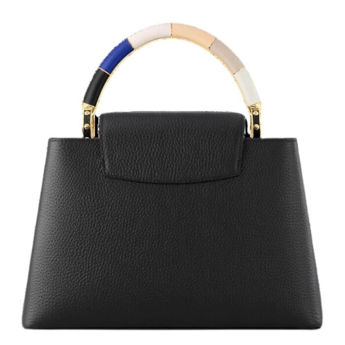 Inspired by the Japanese art of kintsugi, the LOUIS VUITTON CAPUCINES MM handbag celebrates the beauty of imperfection with luxurious elegance. Crafted from full-grain Taurillon leather in a classic black, this sophisticated piece features a unique, jewel-like handle composed of upcycled leather in neutral tones, adorned with shimmering golden rings. This intricate detail pays homage to the kintsugi tradition, where broken ceramics are repaired with lacquer and gold dust, transforming flaws into stunning features.