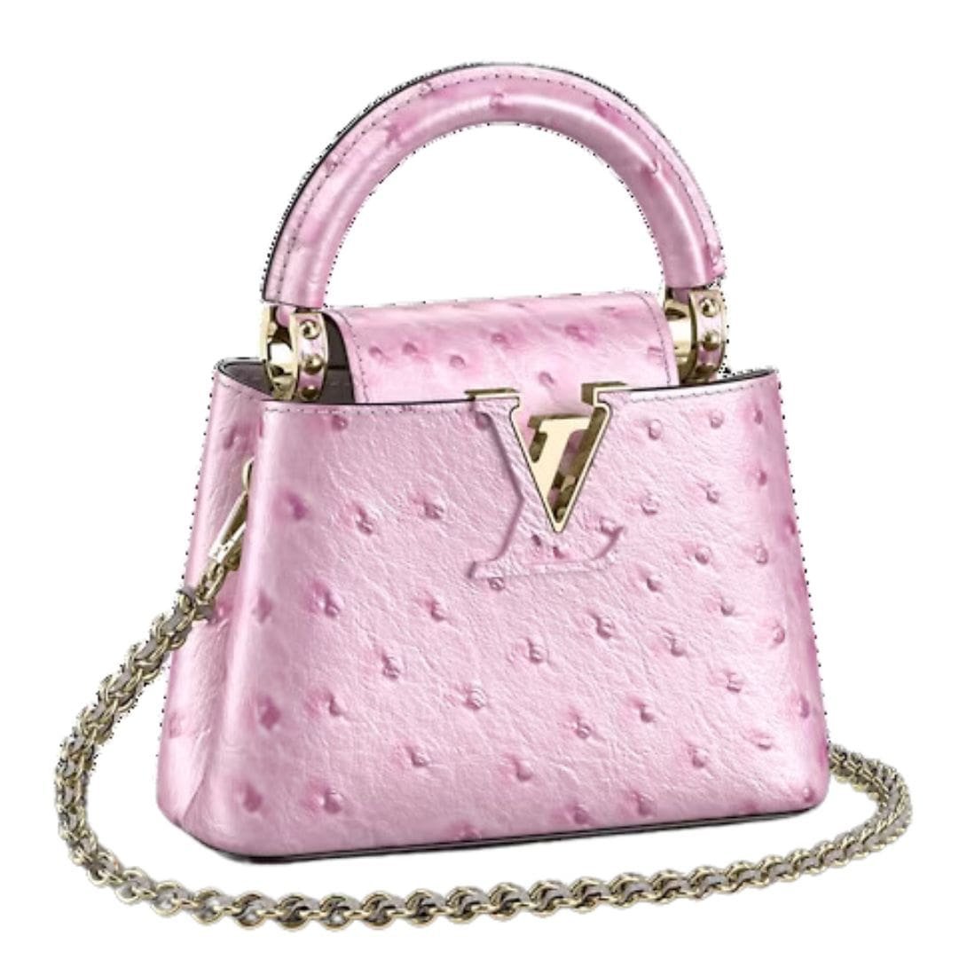 Crafted from exquisite ostrich leather, the LOUIS VUITTON CAPUCINES NANO in Pink Pearl features a luxurious finish inspired by the nacreous aspect of pearls made from the inner layer of the “Mother of Shell.” This pearlescent finish accentuates the distinctive dots of the ostrich leather, creating a unique and refined aesthetic. The interior is lined with soft goatskin and includes a flat pocket made of precious ostrich leather, complete with a removable mirror for on-the-go elegance. The top of the partition separating the two compartments is also adorned with ostrich leather, further enhancing its luxurious appeal.