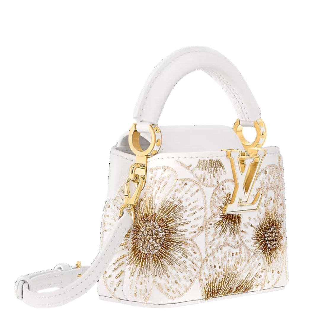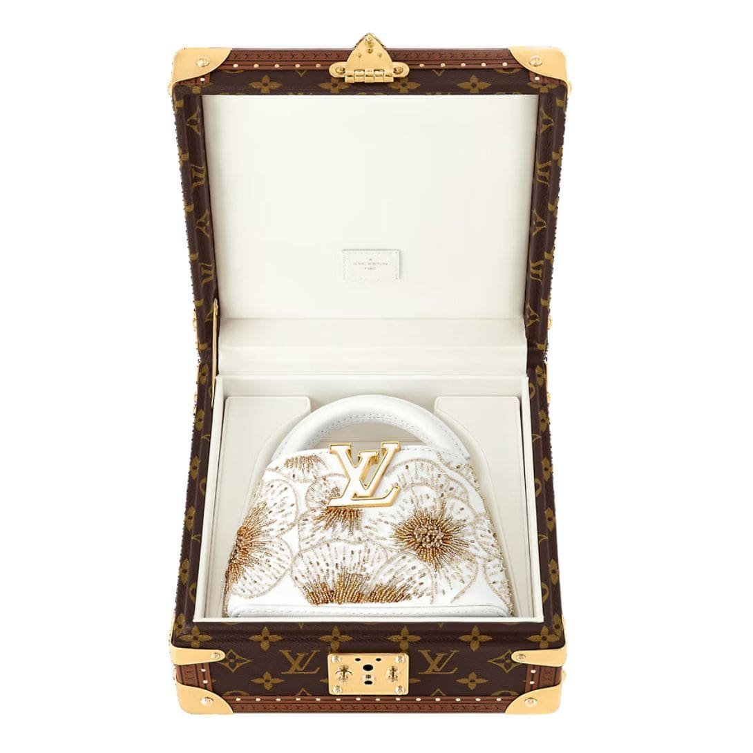 This exceptional edition of the LOUIS VUITTON CAPUCINES NANO is a testament to Louis Vuitton’s artistry and elegance. Featuring a large peony motif meticulously embroidered with tiny beads on pristine white calfskin leather, this piece is both a statement of luxury and a work of art. The exquisite bag is accompanied by a hard-sided presentation box in iconic Monogram canvas, secured with an S-lock closure inspired by historic Louis Vuitton trunks. The box is adorned with a matching peony motif and lined in sumptuous satin, complete with a removable cushion to display and protect the bag.
