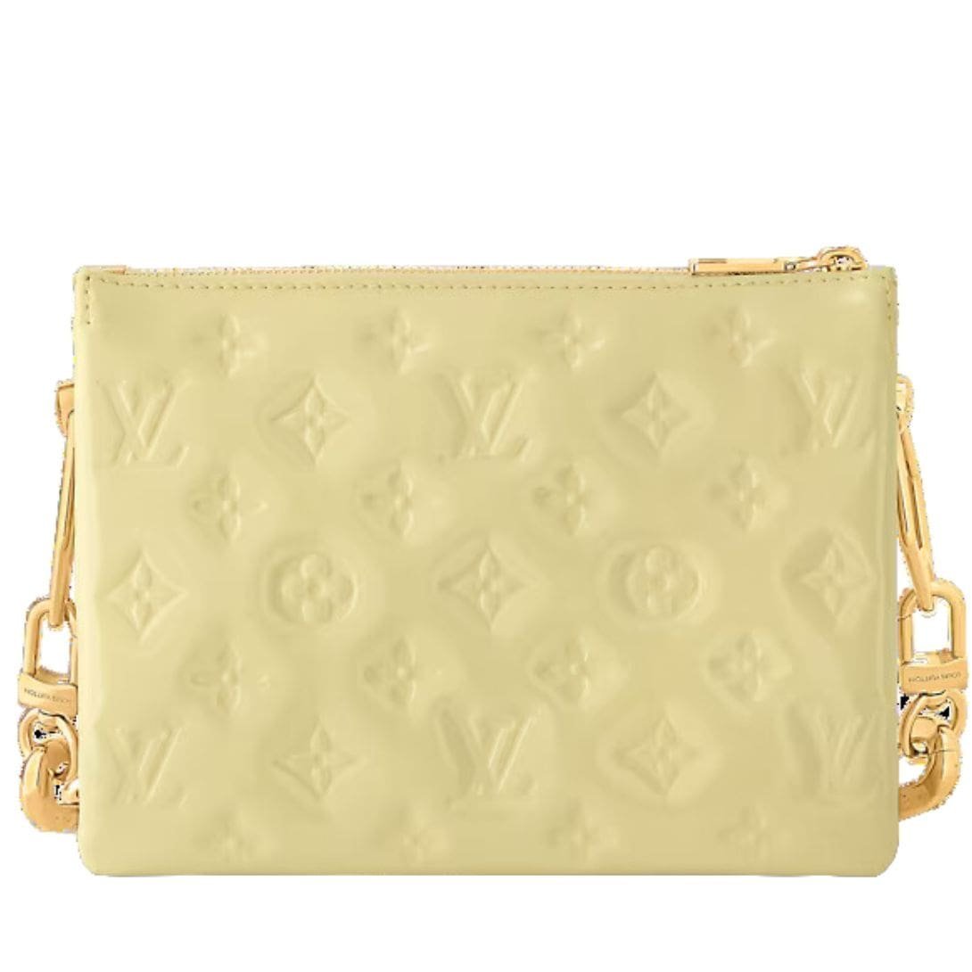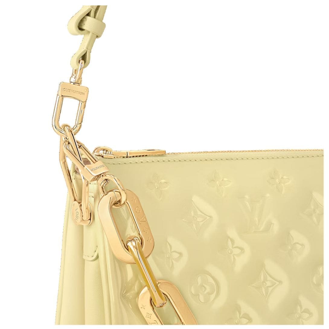 Introducing the LOUIS VUITTON COUSSIN BB in a delightful new hue, Chic & Yellow, with a lustrous finish that adds a touch of glamour to any ensemble. Crafted in puffy varnished calfskin, this compact yet statement-making bag is adorned with embossed Monogram motifs, lending a tactile flair to its design.