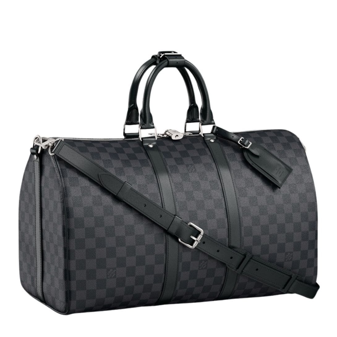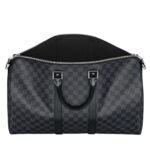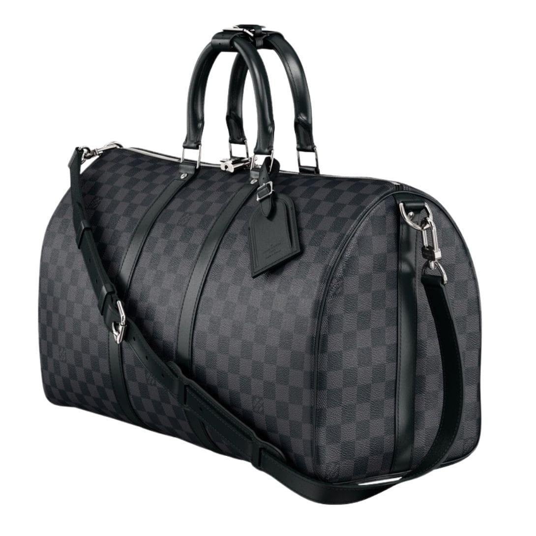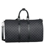 Designed with meticulous attention to detail, this travel LOUIS VUITTON KEEPALL BANDOULIERE 45 bag is fashioned from the iconic Damier Graphite canvas, exuding an air of refined luxury. Its compact yet capacious dimensions of 17.7 x 10.6 x 7.9 inches make it ideal for both short trips and extended journeys, while its cabin size ensures effortless maneuverability through airport terminals and bustling city streets.